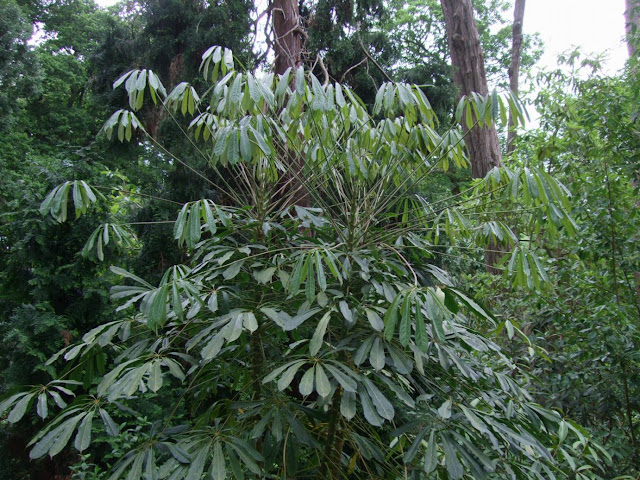 Possibly the tallest Schefflera in the UK? If not then it certainly is the tallest I've ever seen growing in the UK! The photo below still betrays the true scale of this specimen. It is very tall, easily reaching a height of 40 to 50 feet and we found it difficult to look for a place to be able to photograph this plant in it's entirety. So we took it in three sections and pieced together later on. So given their ideal conditions, some Scheffleras can attain majestic heights too in Northern Europe.