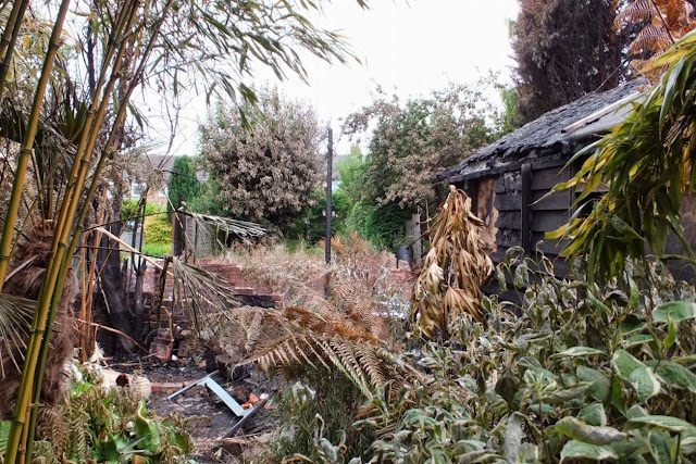 Last Friday at around 2pm I received a phone call saying that the fire brigade are in our garden putting out a fire that started in one of our neighbours garden. Rushing back home, what I found, of what were once very lush and leafy parts of our garden, with a well built outbuilding and a jungle veranda, were these....