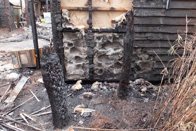 | The garden outbuilding, it was well built and insulated and despite the outside being severely burnt... |
