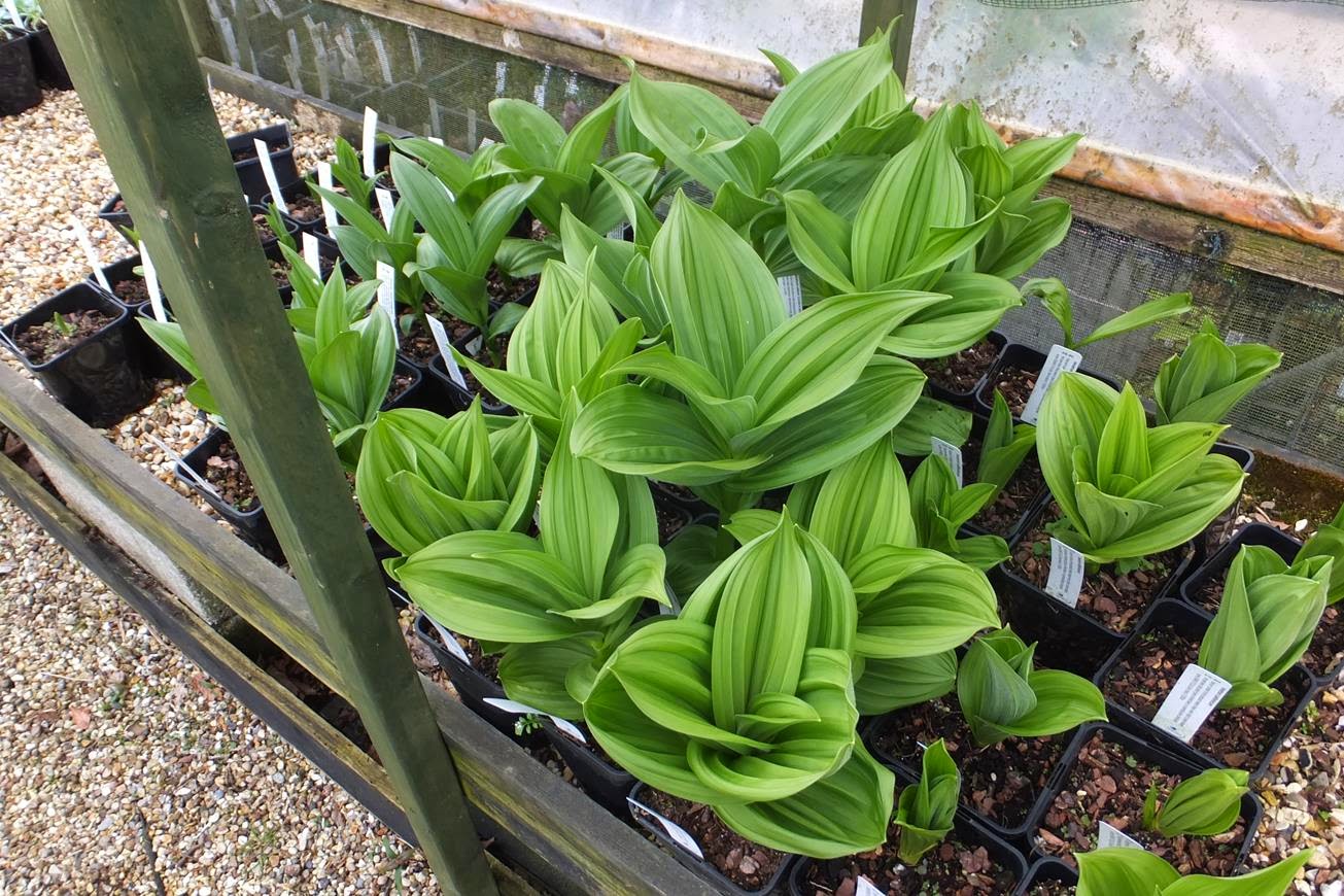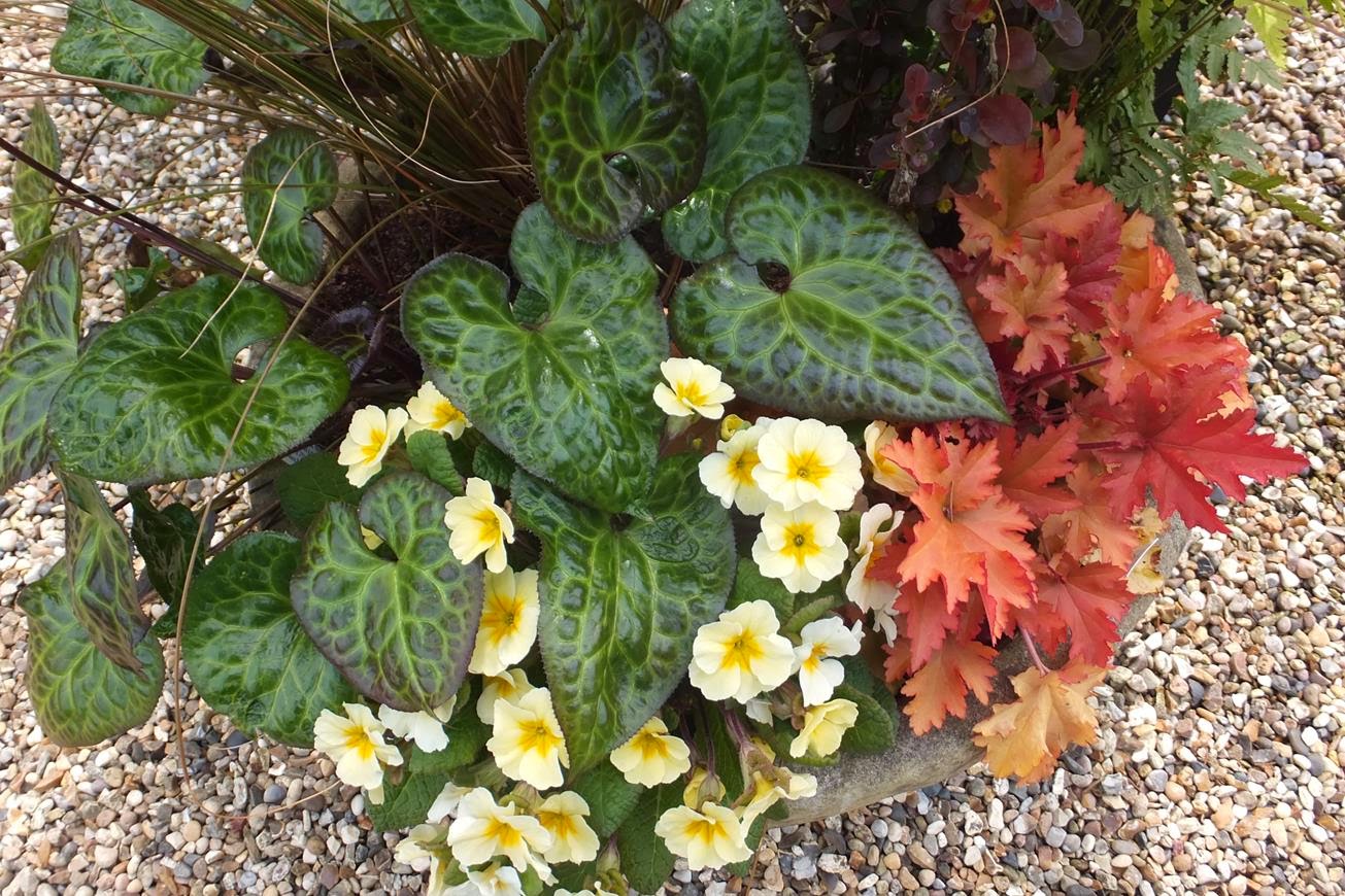 | This is one of their display containers with mixed planting which highlights how lovely and exotic looking Beesia calthifolia (left) is. |