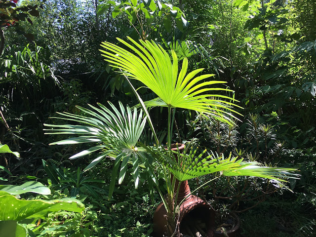 And jumping on to the middle patio, I spotted this Trachycarpus princeps hybrid positively GLOWing as it catches the morning light. Lovely!