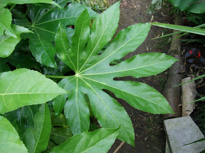 Fatsia japonica has several different varieties available to the exotic gardener in the UK, other than the plain green form. Whilst the other types often have more dramatic colours the plain green is very robust and seems to be quicker and maybe slightly hardier.