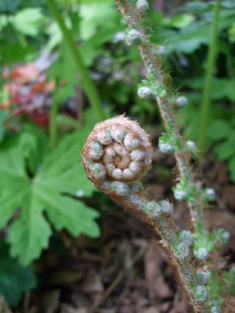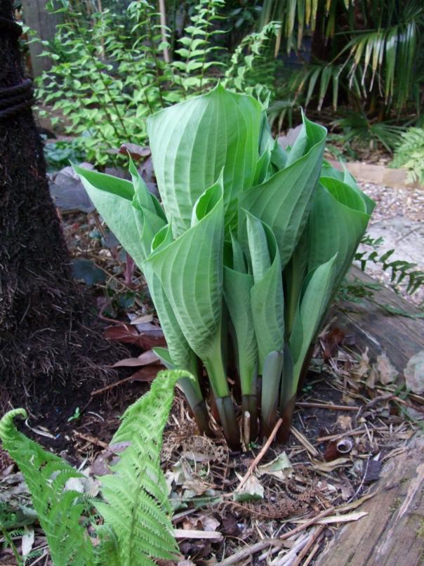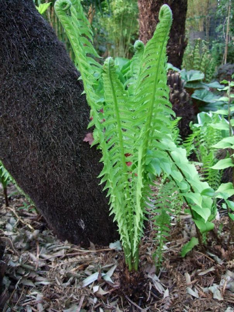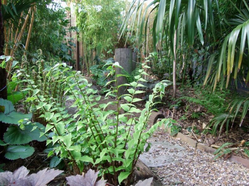 | The fernery is waking up, in a few weeks the tree fern fronds will cast a lot of shade over the Oplopanax horridus in the centre of the photo. |
