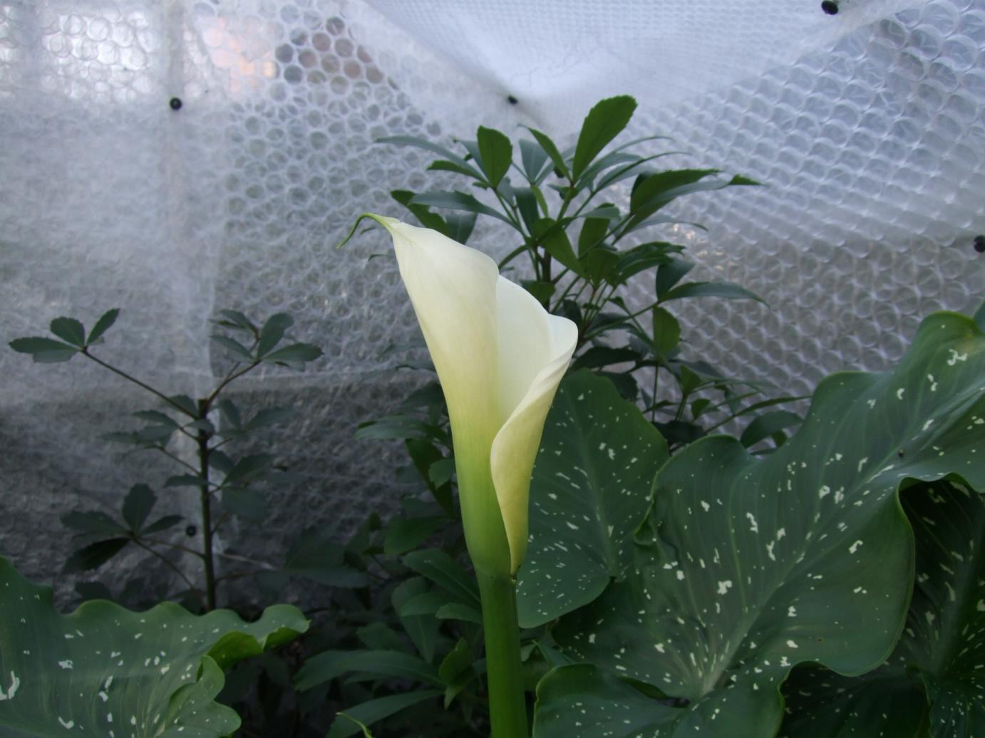 Anyway, slowly and gradually I've been taking out plants to acclimatise them to the cooler life outside of the greenhouse. First out were some of the arids and palms, then a few of the shrubs as they were planted out. The only other arid left inside is a trunked Yucca linearifolia. Although well rooted, the pot is small and the top too heavy that if left outside any gust of wind will just knock it to its side, so best left there until it's ready to be planted. With the reduction in numbers, the remaining plants are no longer as cramped as they were before, enjoying the extra space. One plant enjoying the extra space, especially it's starting grow to a relatively huge size is the Zantedeschia 'White Giant', which is currently flowering. I refer to this plant as 'The Belle of the Greenhouse' with its beautiful flower set against a backdrop of foliage, like a pretty maiden surrounded by dapper men.
