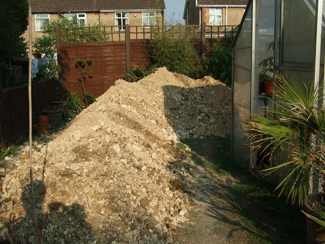 Gerhard of Bamboo and More prompted me on Facebook to post some photos of the rubble that we have removed so far. Rather than one massive mountain of chalk and subsoil, the rubble has been piled in a series of smaller heaps, spread out on certain areas of the new garden, to be compacted later on to raise the current ground level. The topsoil however were saved and will be used to fill in the raised beds currently being built.