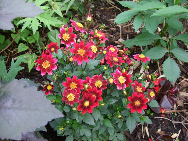Special mention to Dahlia 'Twyning's After Eight' which has turned out to be a hardy, reliable plant for us. It has been through the last three harsh winters here, left outside with nothing more than bark mulch as protection, and yet comes back reliably in the spring. It is even sited on the edge of a patio that gets lots of water run in the winter (not an ideal thing for Dahlias) and yet it doesn't seem to mind it. A tiny cutting in a tiny pot left outside all winter unprotected has also come back, and is now growing vigorously.