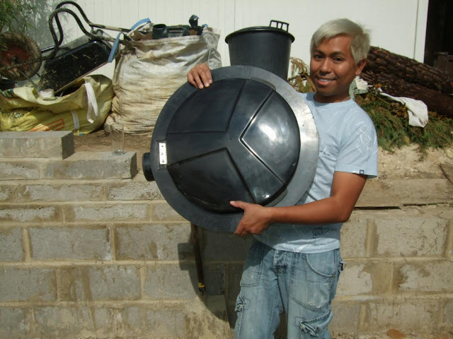 These bottom drains are much, much larger than the standard ones available in specialist shops as they are custom made by one of the members of our Koi club. Both the lid and the bottom part are moulded fibreglass, to be connected on to 4 inch soil pipes upon installation. These large drains remind me of alien space crafts, or rather the props used in filming cheap, alien B-movies!