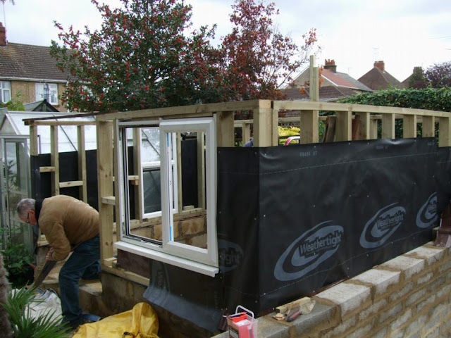 The filter house will be clad in wood, with a reclaimed tile roof. Once it is complete I will show more details of what we have done, but here's a sample complete with my Dad, who is getting the first roof timbers ready.