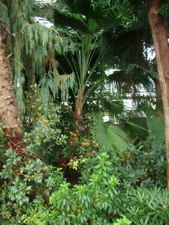 Leaving the arid glasshouse we entered a temperate house, with huge Trachycarpus fortuneii, camelias, and rhododendrons giving the feel of the Himalayan foothills. A particularly large Trachycarpus martianus caught our attention.