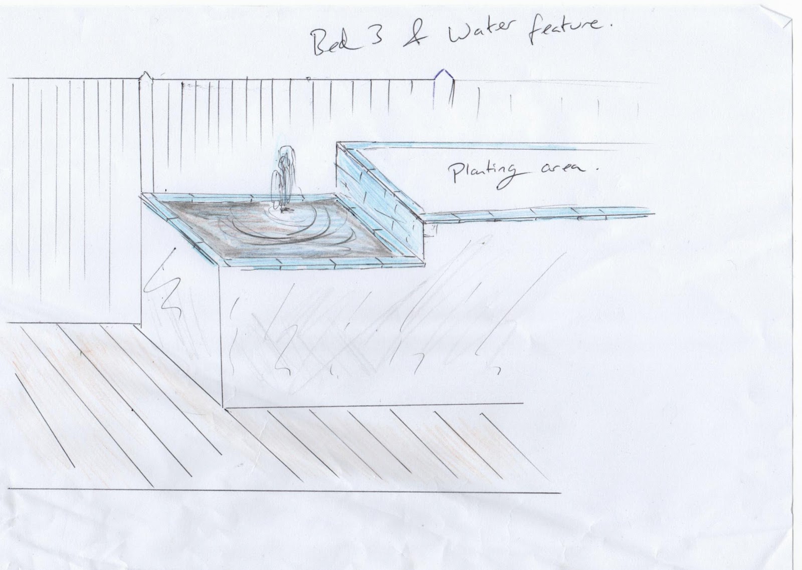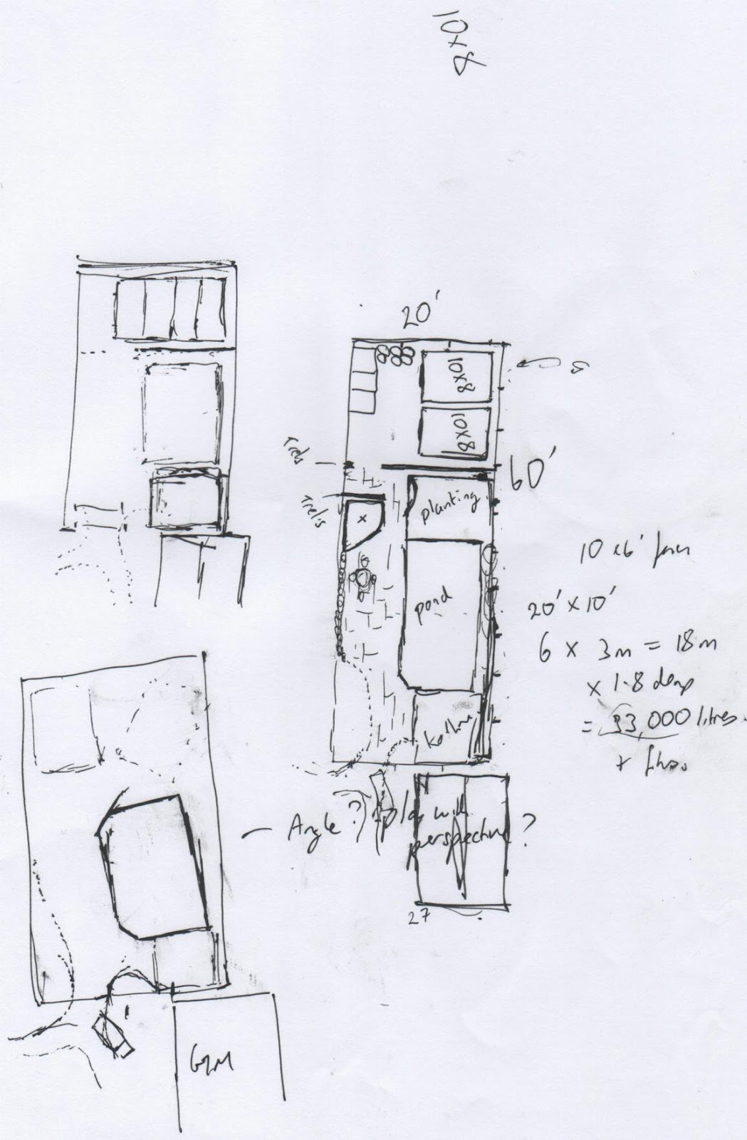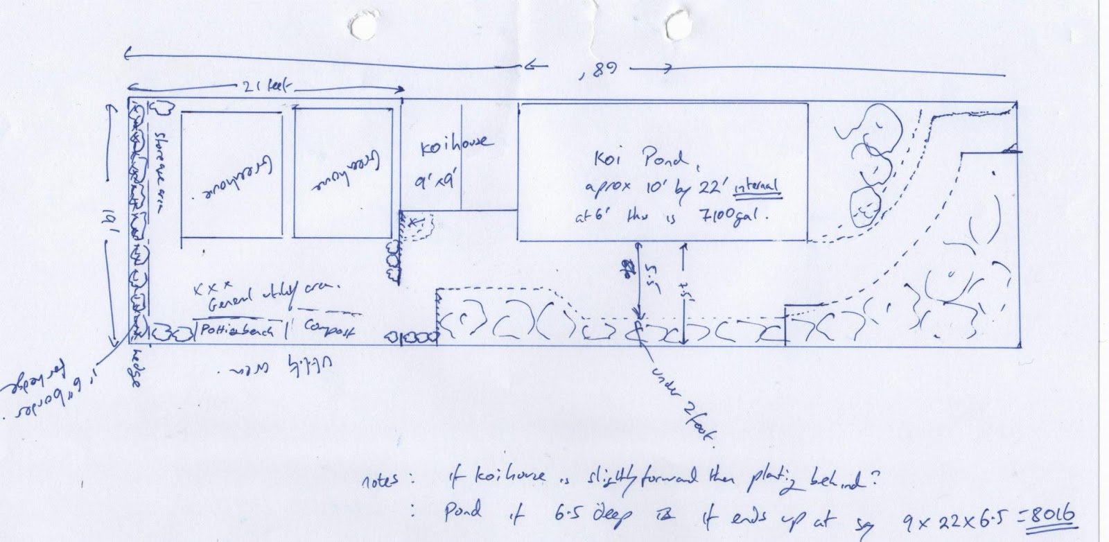 When embarking on any project it is helpful to create several sketches to help you visualize how some of the structures you are building will be in relation to each other. Above is a personal guide on how the filtration house will look like in relation to the pond. The pergola above the pond is not to scale.