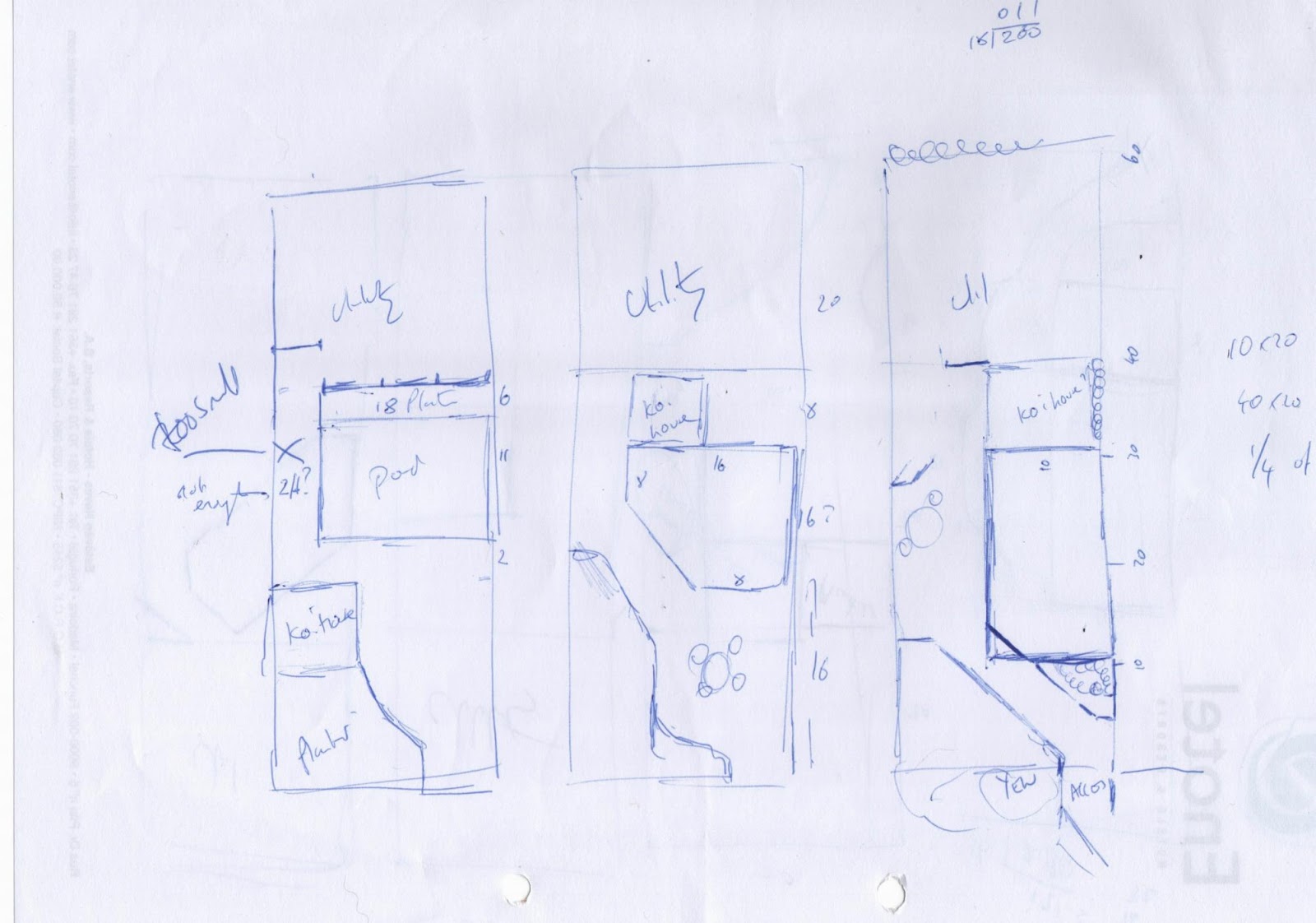 I suppose I should have started, before we featured any aspect of the project on our blog, by showing the plans and sketches of the new garden. Most of these sketches were made on paper, a few were made on the computer but using basic programs rather than sophisticated design software. So how come I never featured these plans before? The answer is just I never took the time to scan these paper sketches until recently hence only featuring them now.