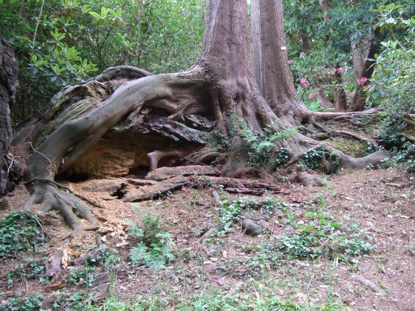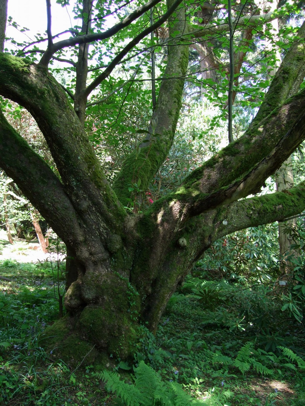 The photo above is a testament to the history and maturity of the garden. A tree has fallen down many years ago and rather than being cleared away, the trunk was left in situ for other plants to grow on to. A couple of saplings managed to thrive on the minimal nutrients from the debris accumulating on the trunk as well as the decaying matter of the trunk itself, with roots slowly descending on to the ground. And once the roots reached the soil the growth rates will have sped up to become huge trees themselves. Eventually all of the dead trunk will rot away and what will be left are just hollows at the base of these trees. A great illustration of the cycle of life in this woodland garden!