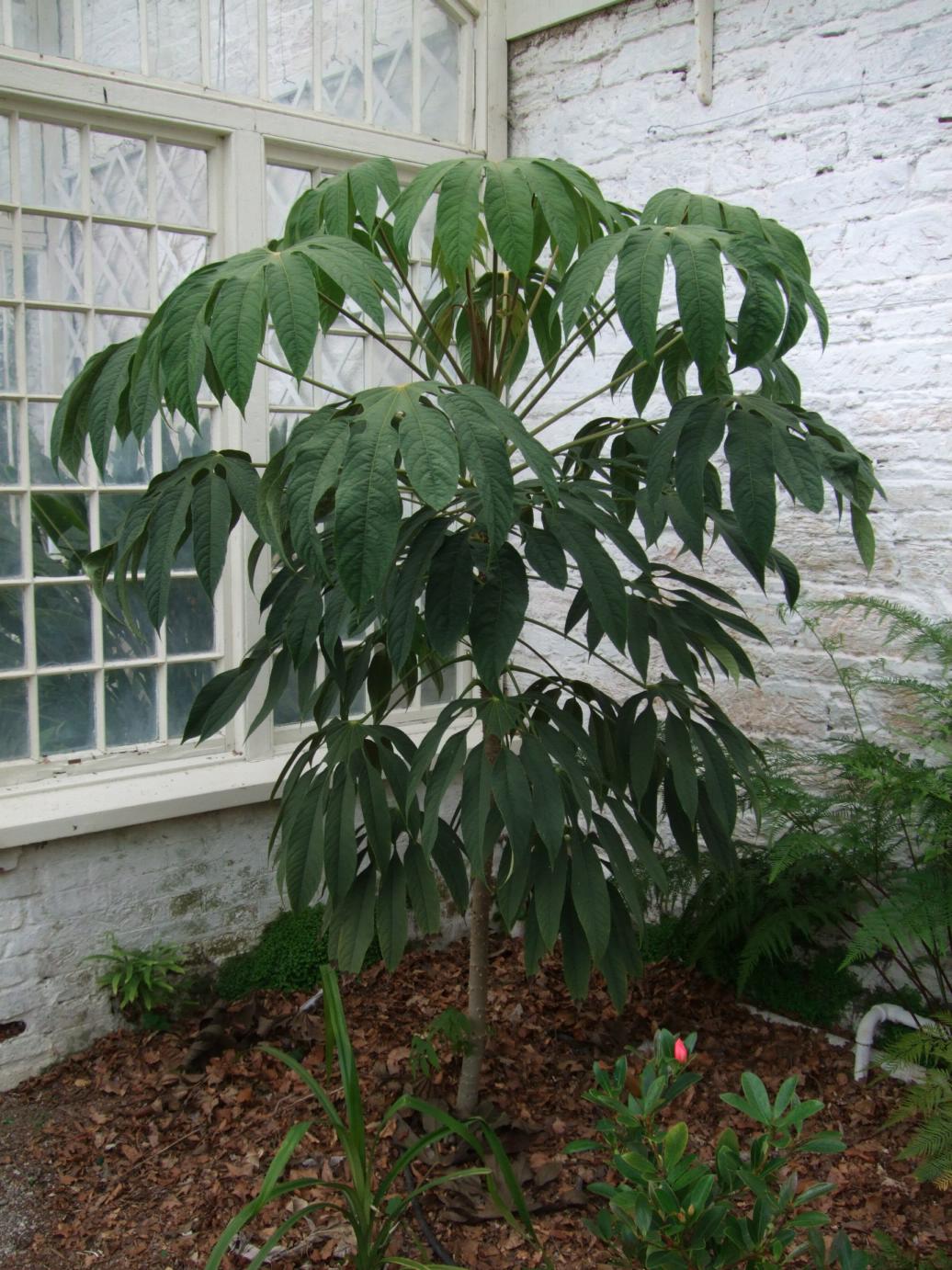 | Schefflera rhododendrifolia growing against a house wall |