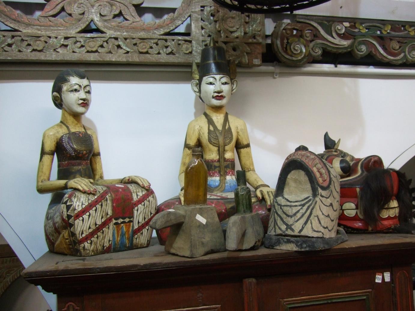 | Masks and other sundries...I quite like the carved Indonesian wooden panel at the top end of this photo |