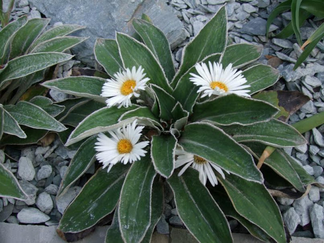 That's a garden centre just designed for both of you, and it looks like the peacock took a shine to you. Is that a form of Celmisia which is flowering very early in your garden. Did you know that Wordpress has the ability to show the title of your plants just by placing your cursor over it.