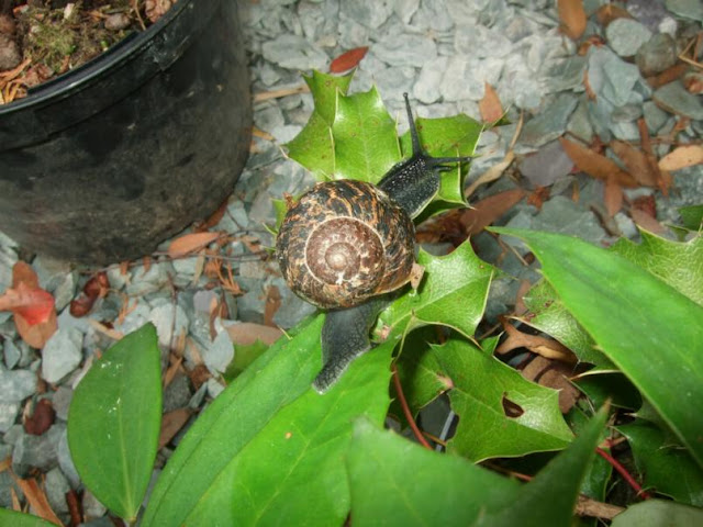 | Even this little fella was enjoying the foliage of Mahonia trifoliolata, although I must confess he didn't get to have his desert. |