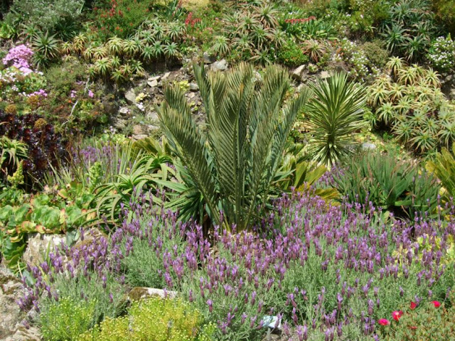 The view from the upper terraces back over the garden is quite impressive, The bendy Butia capitata in the photo above is interesting but always looks tatty.