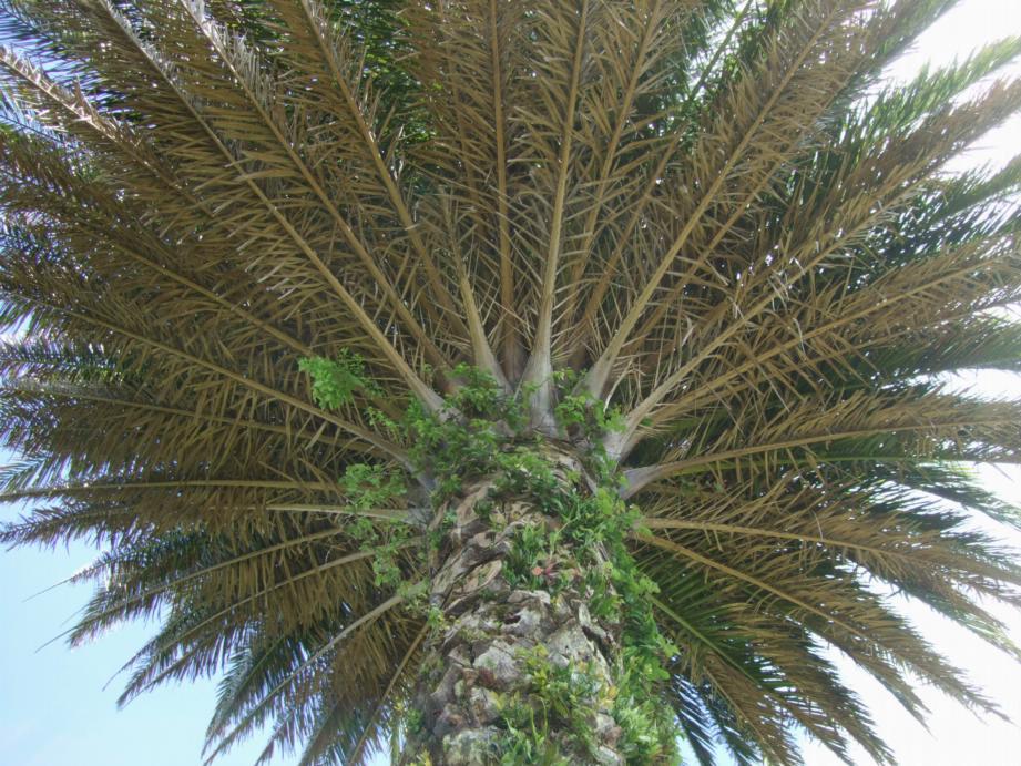 | Don't forget to look up! Some of the taller palms such as this Phoenix canariensis are covered in epiphytes, but with their heads above the shelter belt some look rather tatty. |