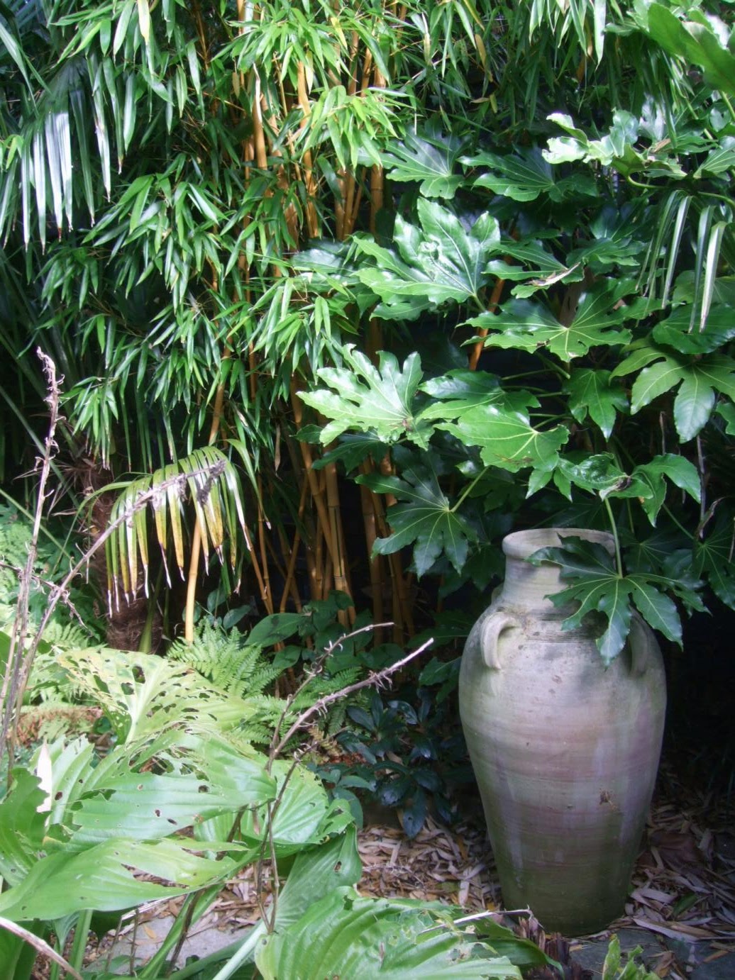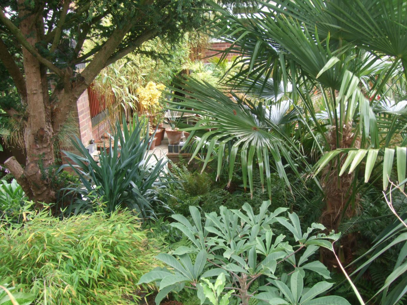 The key is using plants that look for more exotic and tropical than they are, for instance palms such as trachycarpus have no problems for us. Using hardy plants that look exotic combined with more tropical plants in pots gives us the exotic look of the garden.