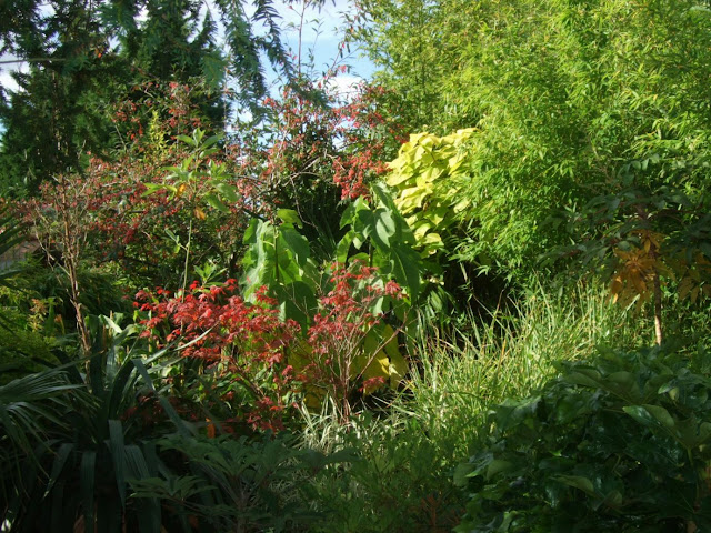 DeleteThe key is using plants that look for more exotic and tropical than they are, for instance palms such as trachycarpus have no problems for us. Using hardy plants that look exotic combined with more tropical plants in pots gives us the exotic look of the garden.