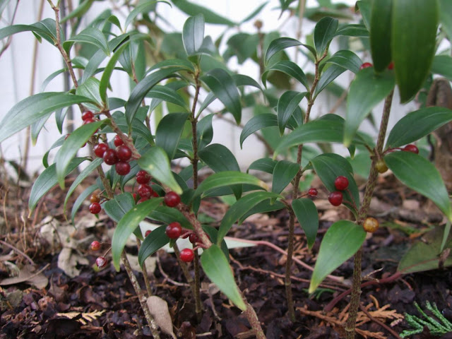 | It looks herbaceous but is actually evergreen, and looking pretty in early January - Polygonatum punctatum |