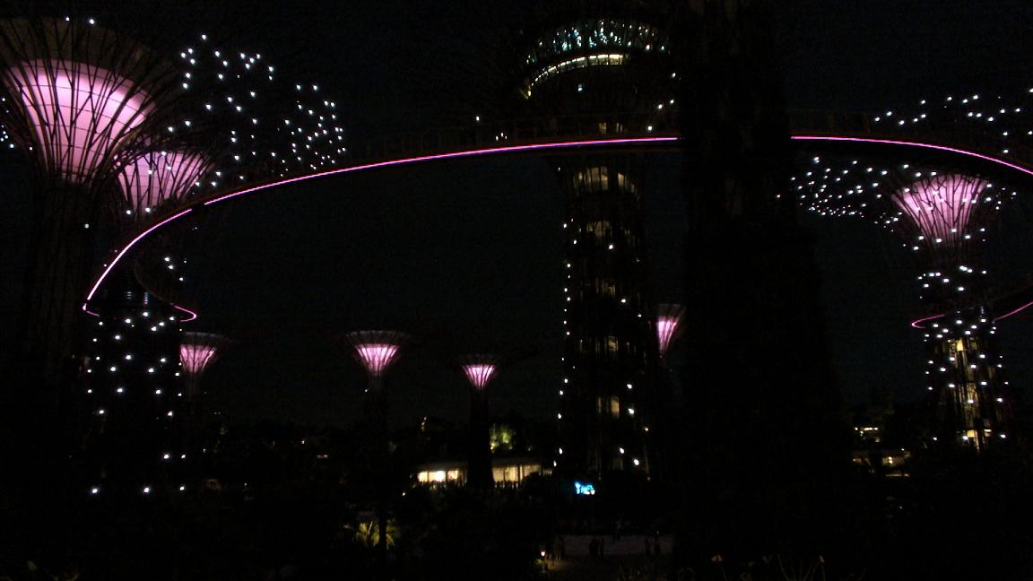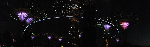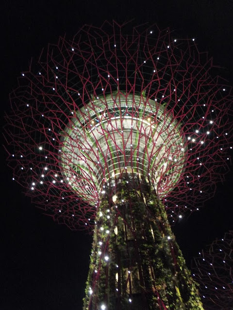 It's snowing again at home but we've managed to escape it this time as we are currently enjoying the warmth and tropical lushness of Singapore. This evening we've just been to watch the light and sound show of the Supertree Grove at Gardens by the Bay - the newest and grandest botanical attraction of this metropolitan and very green nation.
