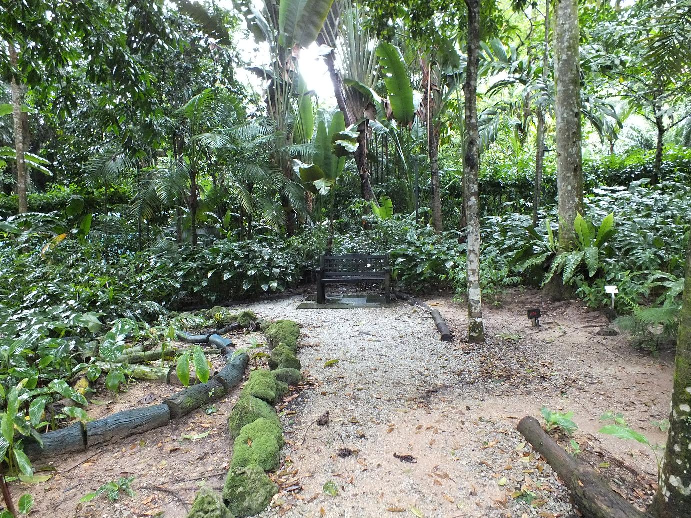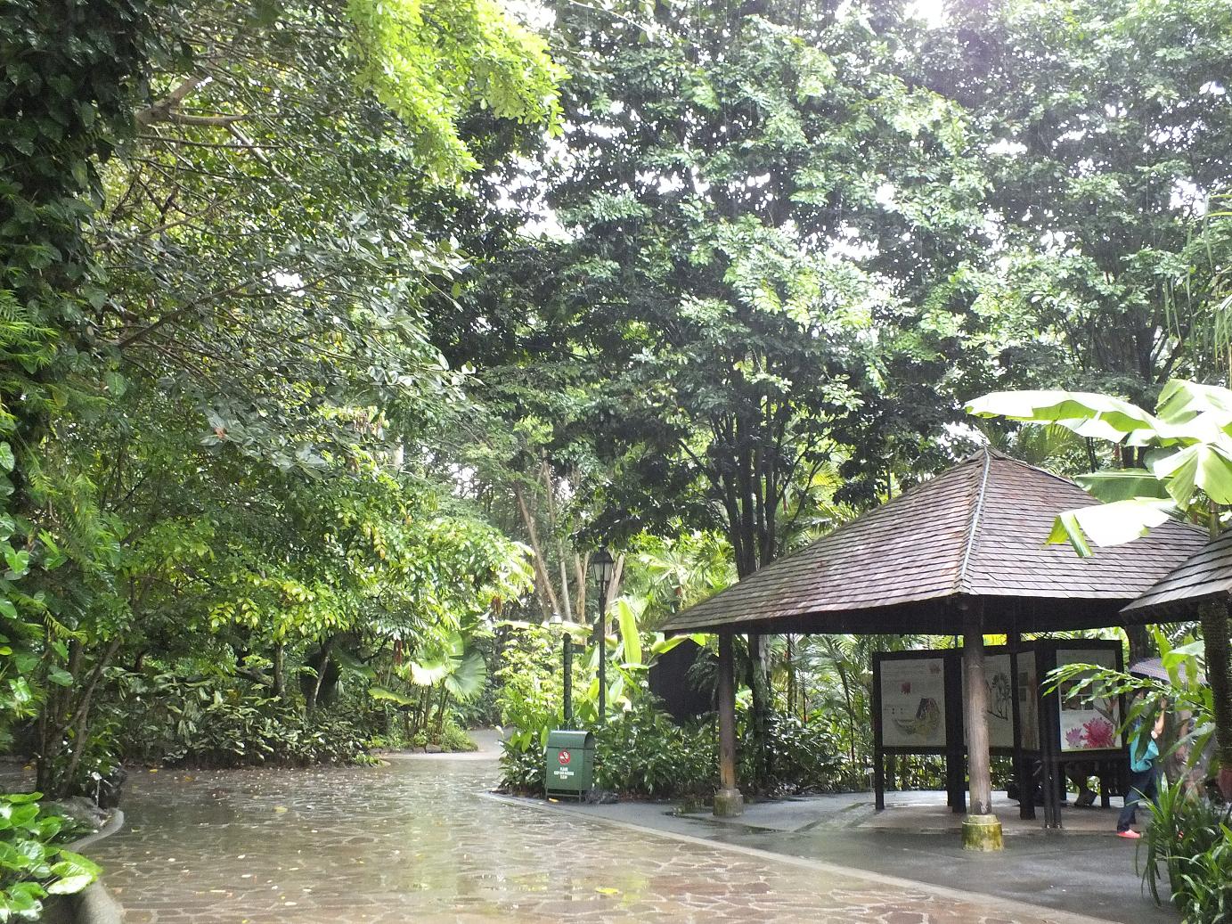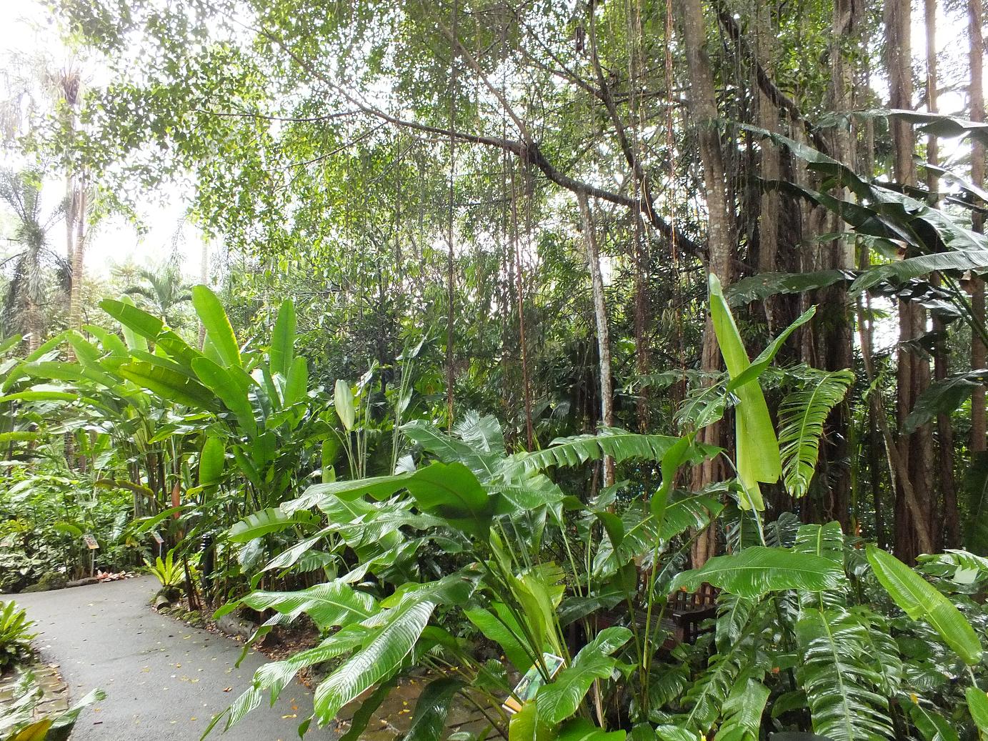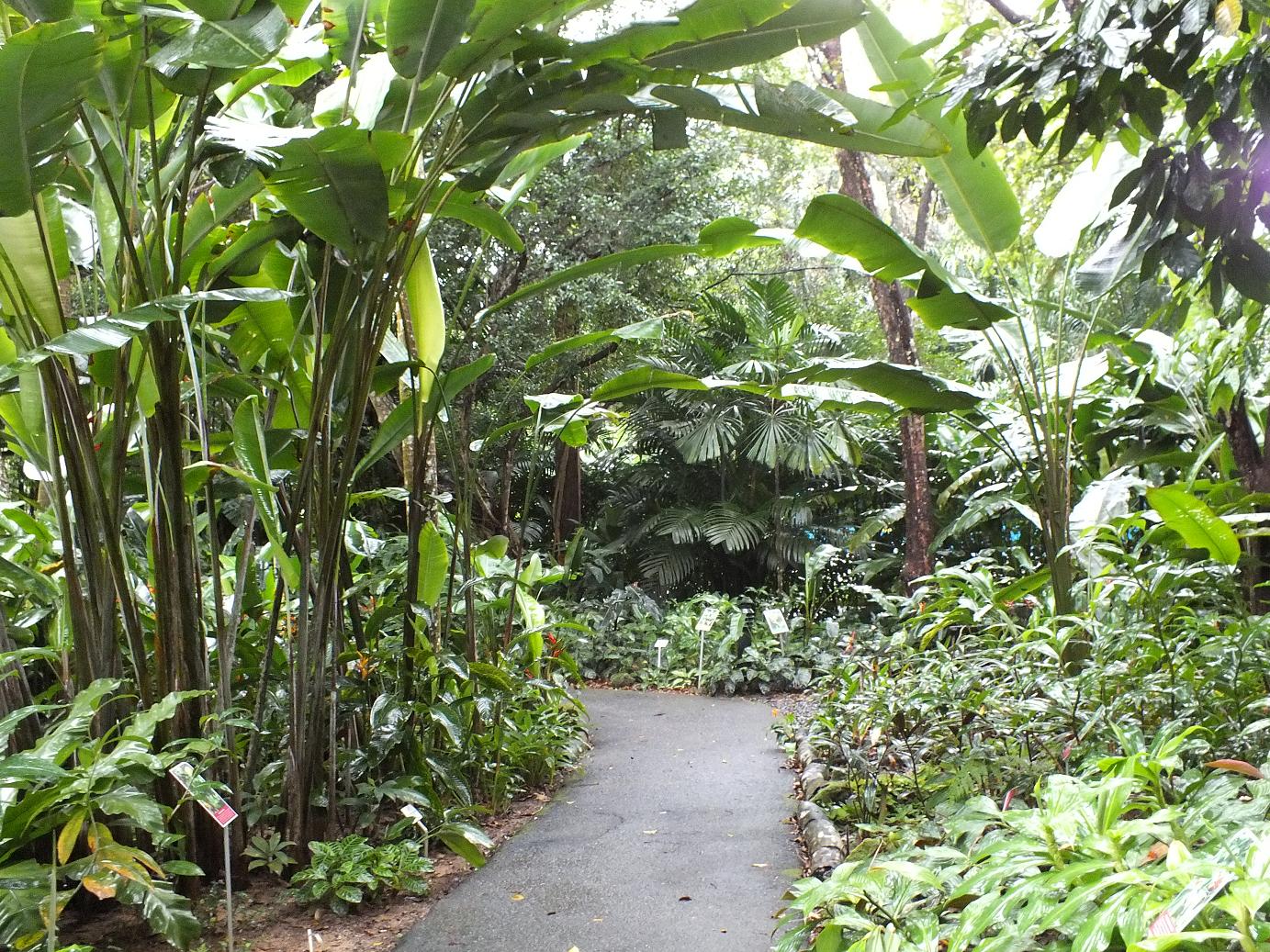 | The pathway that leads to the Ginger Garden, with towering trees indicating the botanic gardens' maturity |