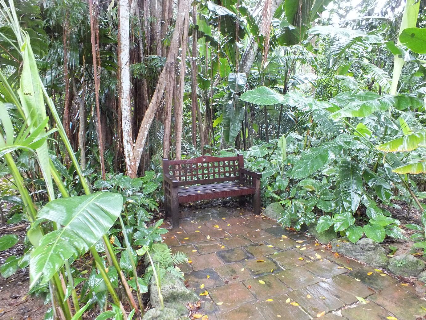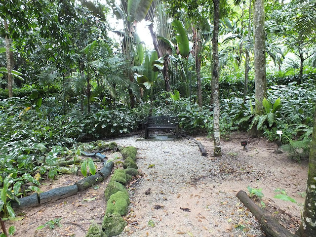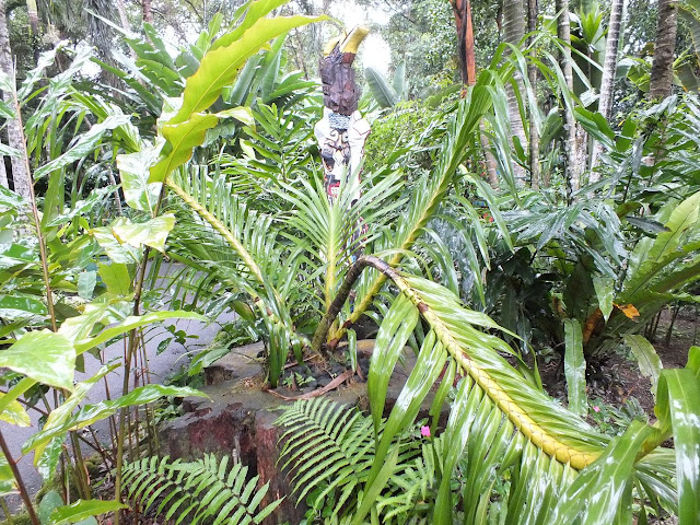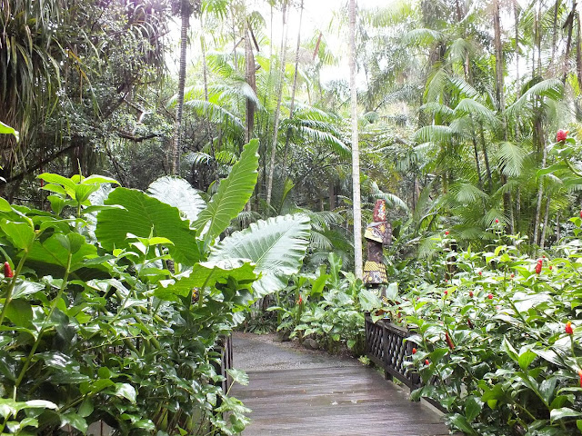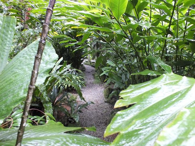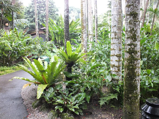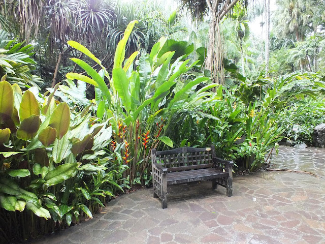 There weren't many that were in bloom when we visited, just a few to give a shot of colour here and there rather than a riot of it but what struck me the most is how this garden was presented; the pathways, the plants, hard landscaping, and seating areas. Forget the blooms, what I loved the most about this area is that it is a stunning jungle garden. After all, nearly all gingers make fabulous foliage plants. Mass them together, combined with towering palms, mature trees, and leafy epiphytes here and there; and gloss them all with a tropical rain shower and the scene is complete, and even perfect. Come and explore the ginger jungle garden with us....