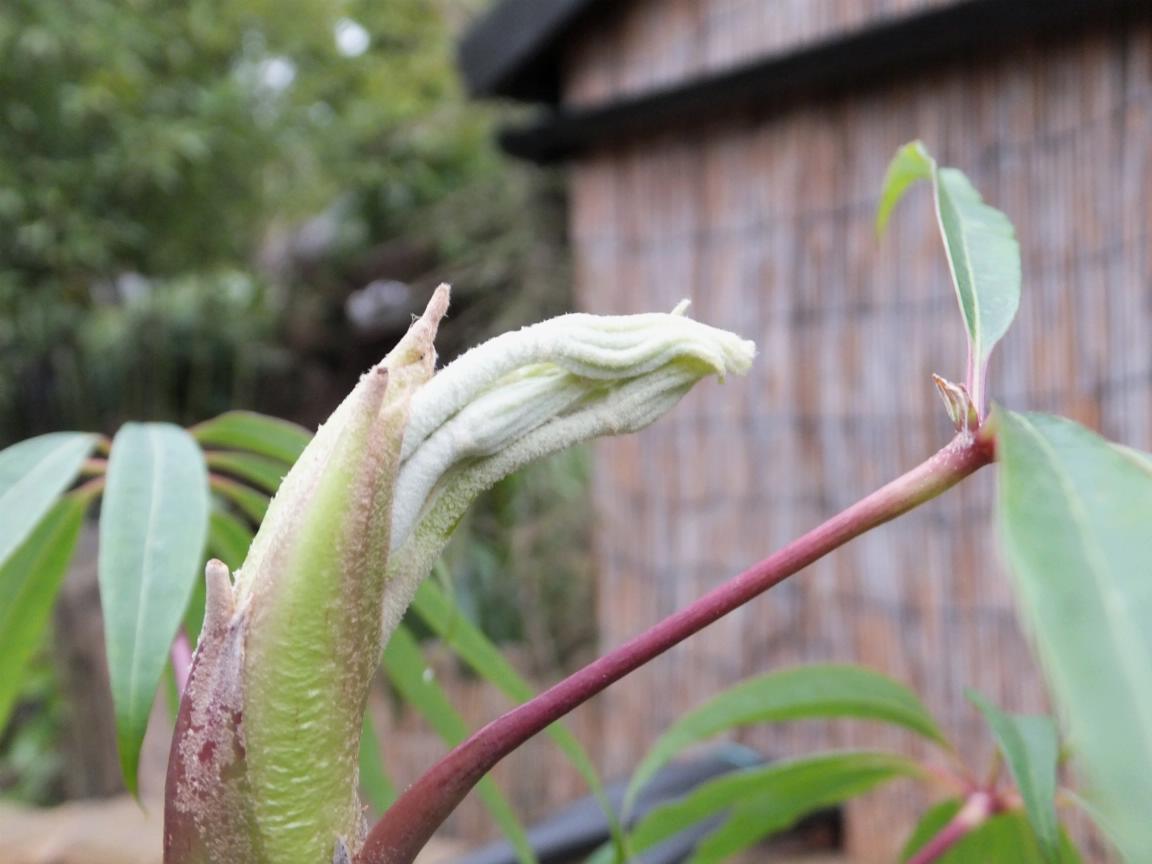 Schefflera macrophylla has to be one of the most spectacular Scheffleras available although for us it has proved to be too tender to plant out. We have tried twice, the first time the plant was killed to the ground but re-sprouted (we potted it on and its starting to make a nice plant). The second time we tried the plant was killed out right. This one is kept potted and was tucked away when the worst of the cold weather was expected. It probably saw temperatures close to 0c but even then that was within the confines of the filter house.