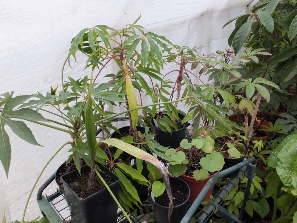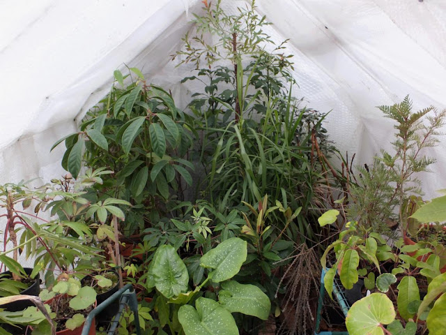 And on the other side a few more plants waiting their time to be planted out, including Fatsia polycarpa and small Schefflera taiwania. The young palm seedling in the lower left of the photo is a Butyagrus - the mule palm, a cross between a Butia and a Syagrus palm, there was hope at one point that this would be a hardy palm for the UK, however sadly this has proved not to be the case.