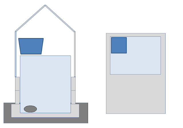 This is roughly what we are thinking, the image on the left is a cross section through the pond. This will be sunk slightly into the ground and then built up. The greenhouse itself will be raised up on blocks to give a more head height and space.