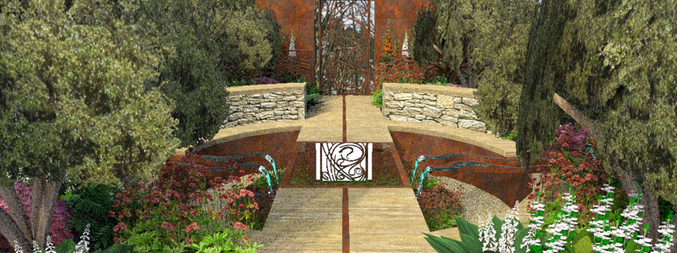 Designed by Cool Gardens, four multi stem Corylus avellana ‘Contorta’ specimens will dominate this garden. Corten steel has been chosen to be used for the rear feature wall, rills and decorative elements as it highlights the natural colours of the surrounding landscape. The main central axis of the garden leads over a structural glass panel to the ornate gate at the rear, offering glimpses of the wider landscape beyond.