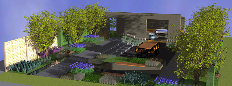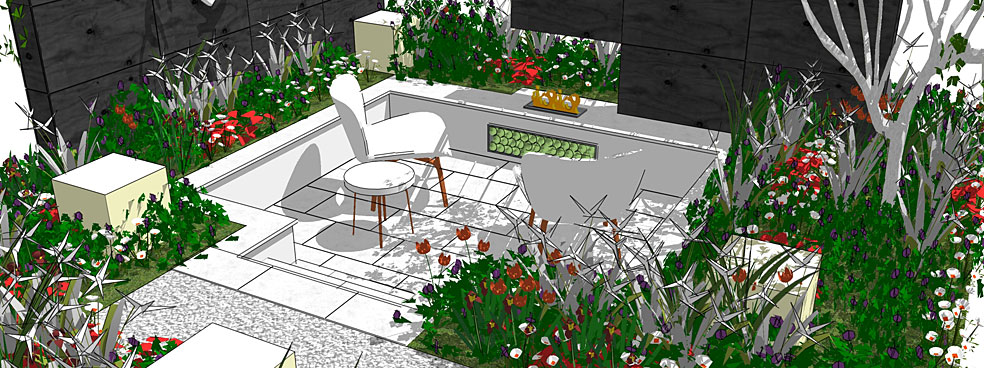 Dan Bowyer has designed The Garden Pad with a bachelor in mind who enjoys the finer things in life and wants a contemporary space for relaxing and entertaining, both during the day and at night. The design creates the perfect atmosphere for entertaining. It features stained black ash walls that have been specially treated for outdoor use, a fireplace and seating for two, within a planting scheme of birch trees and other plants chosen to provide maximum summer enjoyment.
