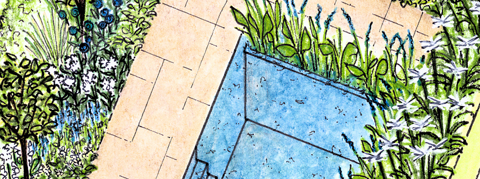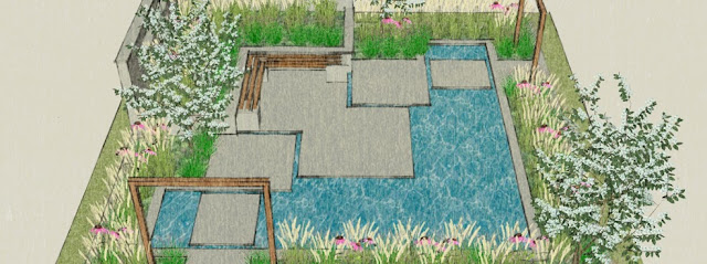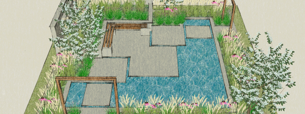 Splash is the perfect place to sit, relax and take a dip! The garden’s central feature is a splash pool, a playful water feature that is refreshing on a hot summer's day. The design has a fresh colour scheme that reflects and complements the splash pool. There are beds of aquatic plants within the pool and a raised planter along the right hand side of the garden. Planted borders wrap around the left hand side and trees add height.