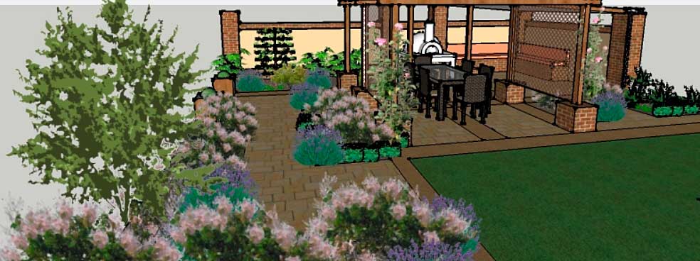 This is a walled garden designed for people who want use their outdoor space whatever the weather. There is a lawn for sunbathing, a pergola dining area for entertaining, a covered area for wet weather and a pizza oven that provides heat and hot food to keep you going well into the evening. The chef of the family can find fresh produce in the edible border and a cutting border provides flowers for the home and gifts for friends. The green roof and the borders attract wildlife so you can sit at the table surrounded by flowers, butterflies and bird song.