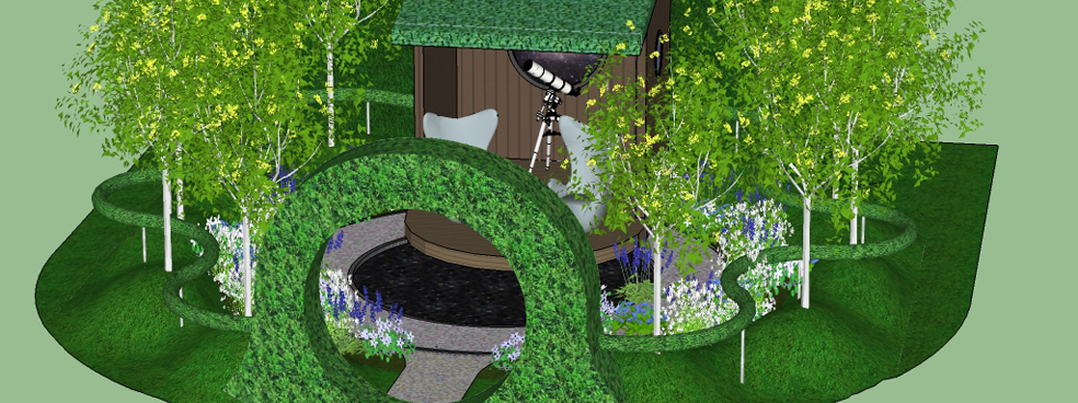 Located in a woodland glade, The Star Gazer’s Retreat houses a sedum-roofed observatory, which provides space to observe the stars by night and to relax and enjoy the garden and its wildlife by day. Home to an eccentric astronomer, the design features quirky sculptural elements inspired by outer space. The garden is entered via a planted star gate and encircled by a hydroponic living sculpture. It comes alive at night, when the nocturnal plants release their fragrance and the stars are reflected in the pool. The garden was inspired by an exhibition of the work of local astronomer and photographer Peter Shah, who captures inspirational photographs of the stars from his garden shed.