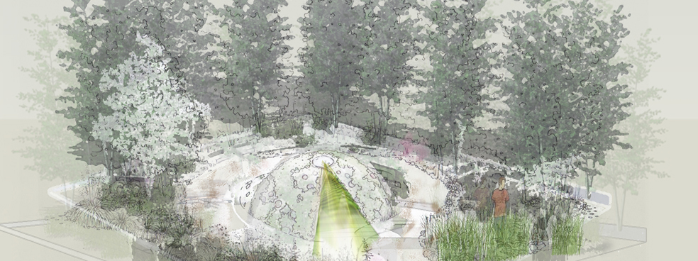 A Stainless Century celebrates the invention of stainless steel in Sheffield by Harry Brearley 100 years ago, and the impact this invention has had on the city and on the world. A central water feature depicts the flow of molten metal as it pours from a white hot crucible to form steel bars. A pergola and wall feature inspired by iconic buildings in Sheffield give height and demonstrate the structural and decorative qualities of steel. The planting reflects the theme with metallic-coloured foliage and flowers. Rusted steel accents highlight the impact that stainless steel has had in freeing the world from corrosion.