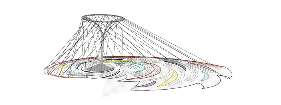 This garden is designed to highlight the awe-inspiring nature of a galaxy and the scientific rules that govern it. It consists of an elliptical spiral of raked gravel with a concave cross-section, through which there are planted clusters of individual foliage plants, grouped by colour. The whole garden is enclosed by a steel and wire vortex structure that rises three metres into the air. Inspired by Einstein’s theories concerning the curvature of space/time, gravitational waves and the relationships between large and small particles in the universe, the garden is a reflection on the insignificance of mankind within a galactic context.