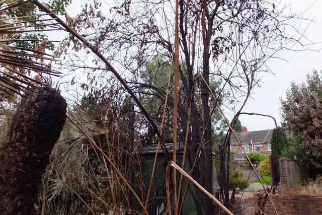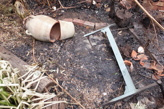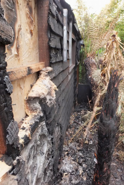 Last Friday at around 2pm I received a phone call saying that the fire brigade are in our garden putting out a fire that started in one of our neighbours garden. Rushing back home, what I found, of what were once very lush and leafy parts of our garden, with a well built outbuilding and a jungle veranda, were these....