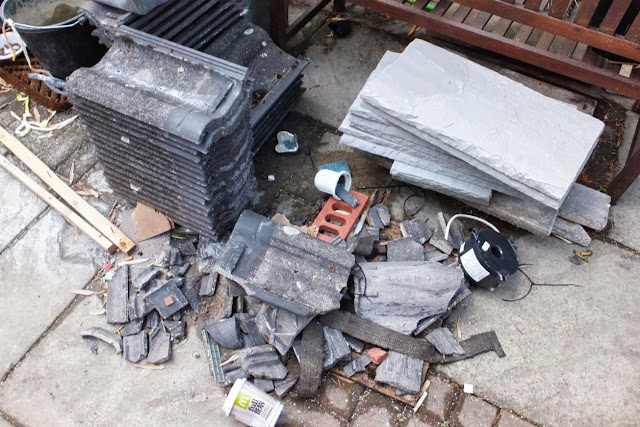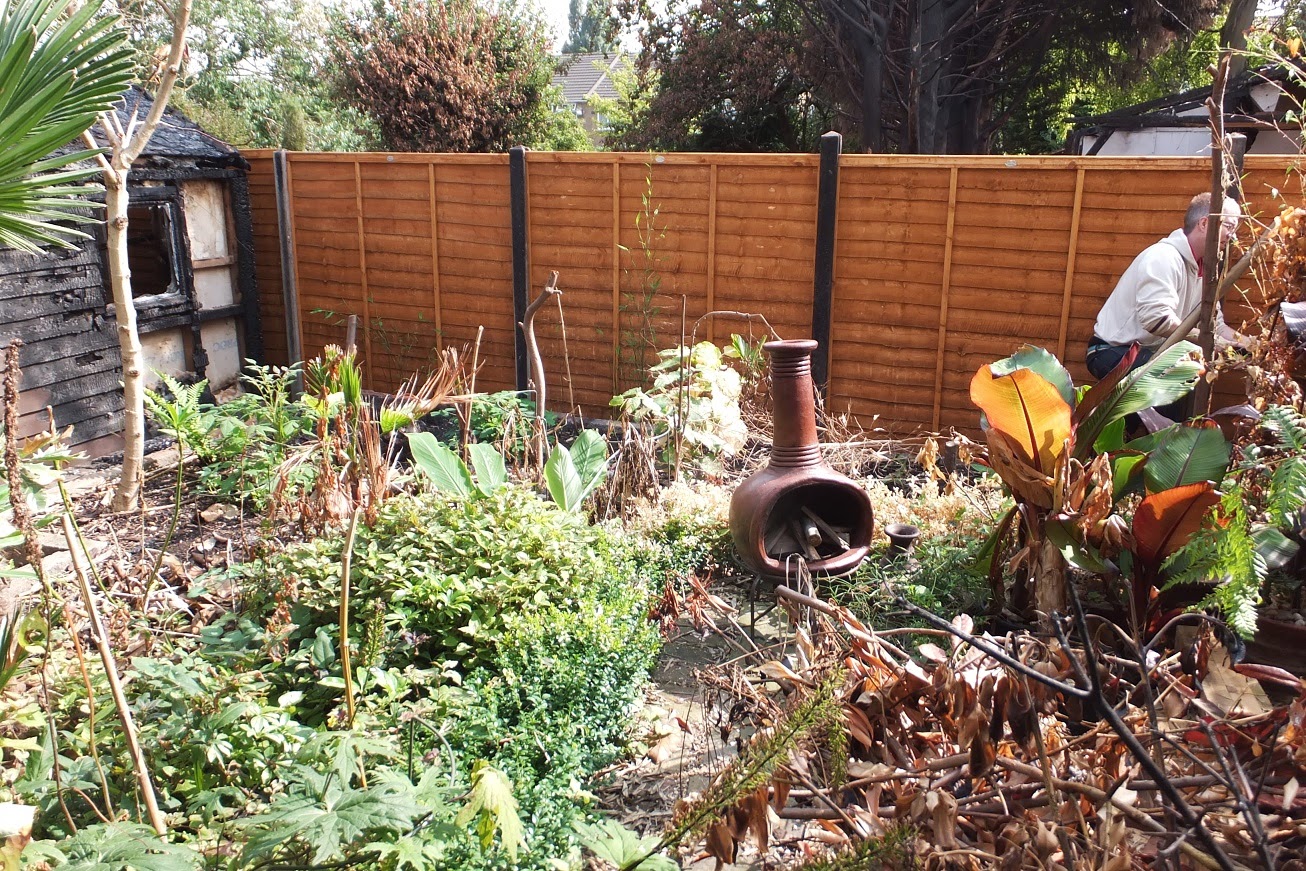 Clear up of the area has been slow due to the house taking priority but steady as we go bit by bit on some evenings after work. The builders who will be in charge of clearing up and rebuilding the 'Jungle Hut' are the same ones renovating our house so whilst house work is ongoing then they have very little time to devote to our garden. We did say though that we could do with restoring at least some of the privacy back into our garden by getting some of the new, replacement fences up which they did a few days ago.