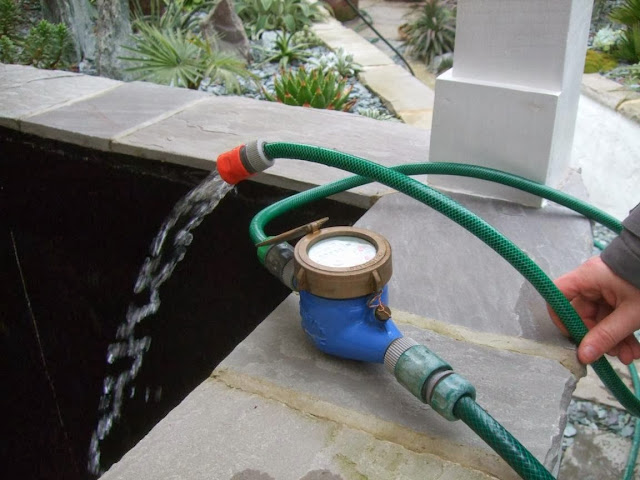 And after all that we could finally fill the pond! We borrowed a water meter to get an accurate reading on the final water volume (just over 8,000 gallons, nearly 37,000 litres)