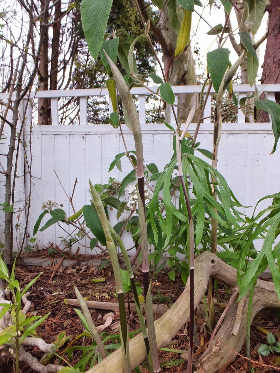 | Arum maculatum is at its peak and looks so exotic. When the foliage starts to die down in a few weeks time the ground ferns that are currently covered by it takes over to maintain the lushness on this tiny area |