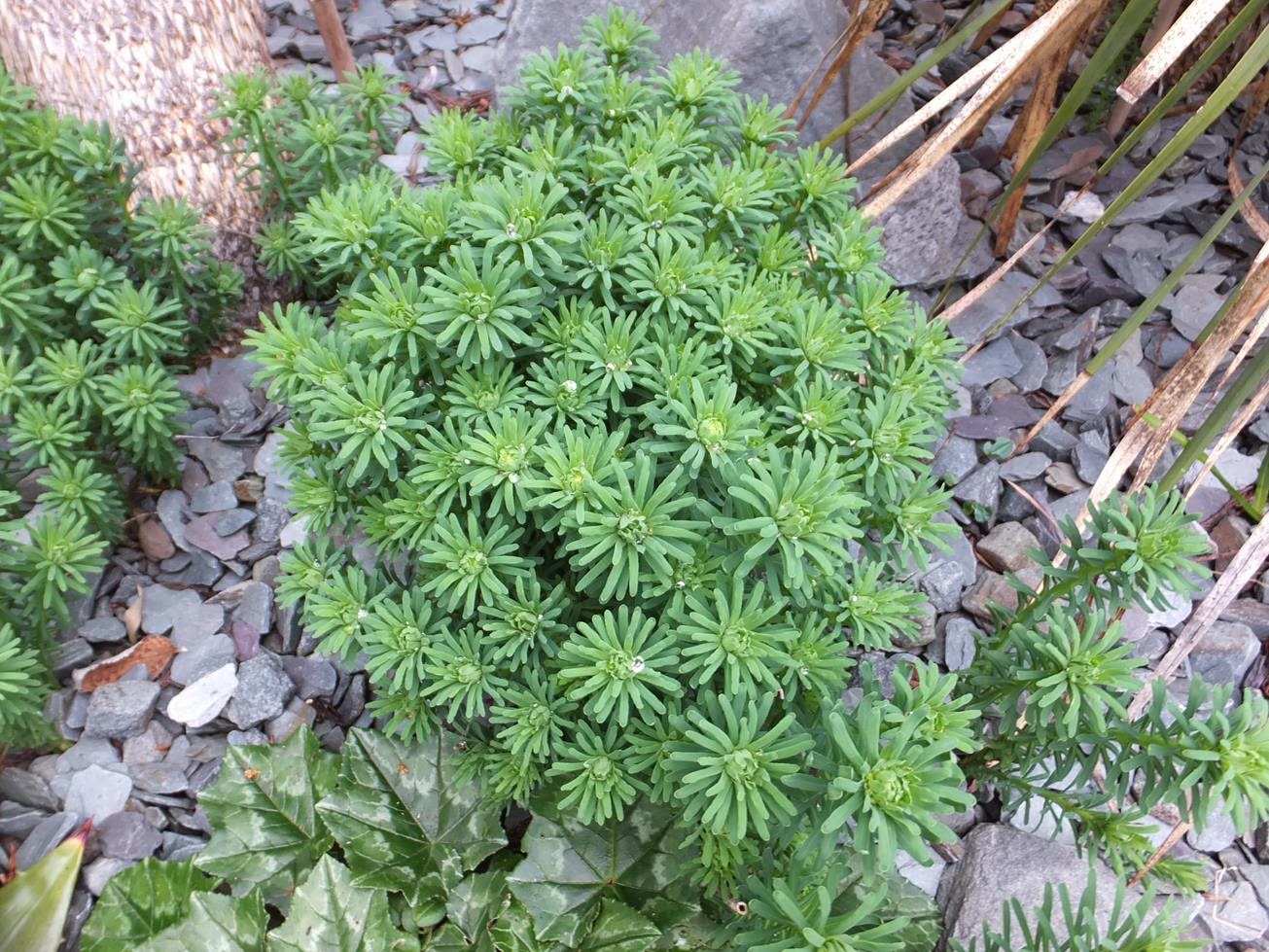 | Euphorbia deflexa. I love the way it looks as it grows and gets bigger in the spring, looking more like a bunch of green flowers/daisies with its delicate foliage tightly clumped together. It can spread out a bit but not that difficult to keep in check. A small growing Euphorbia that we highly recommend! |