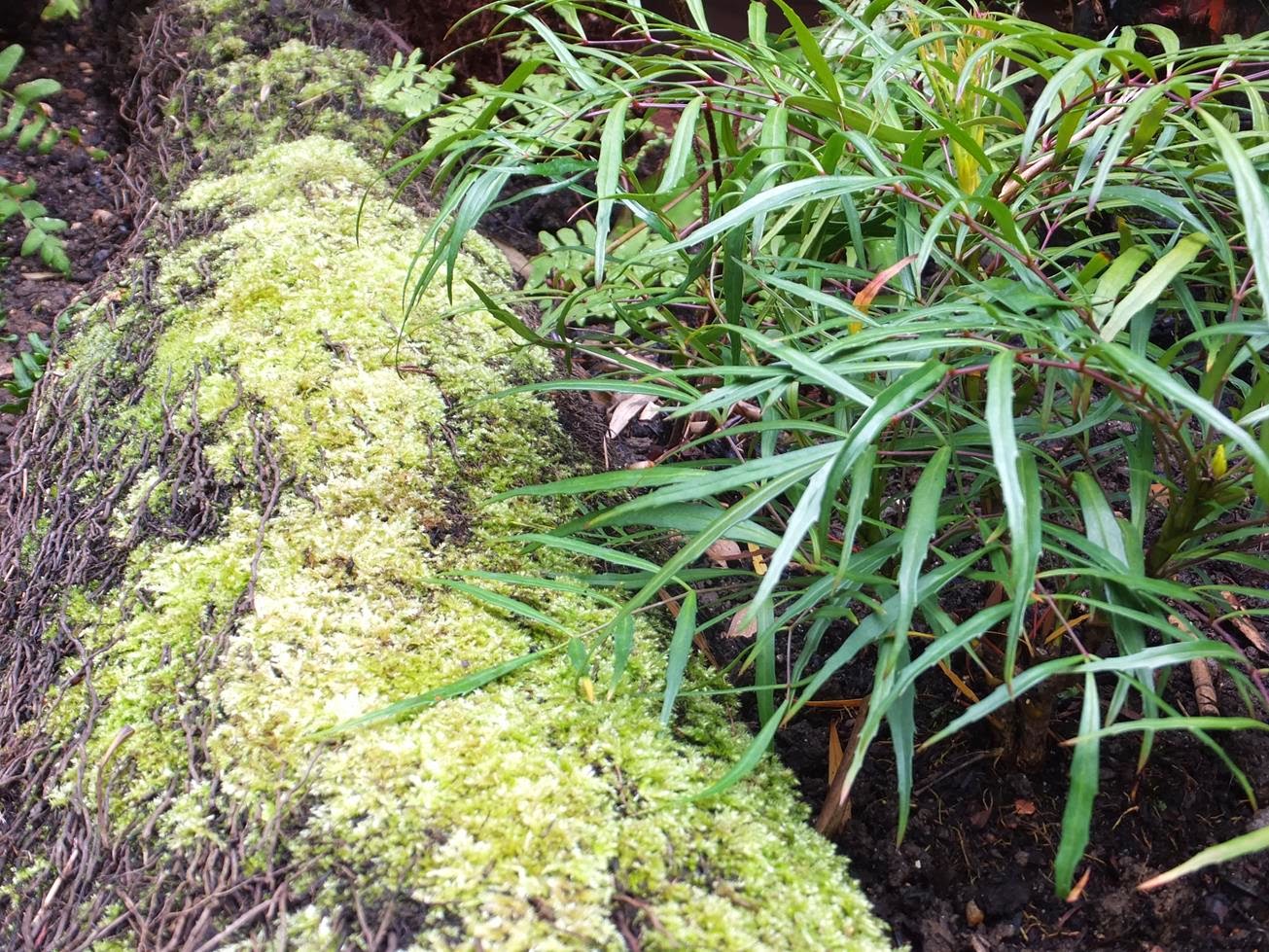 Mahonia eurybracteata subsp. ganpinensis 'Soft Caress' softly caressing a log of moss...