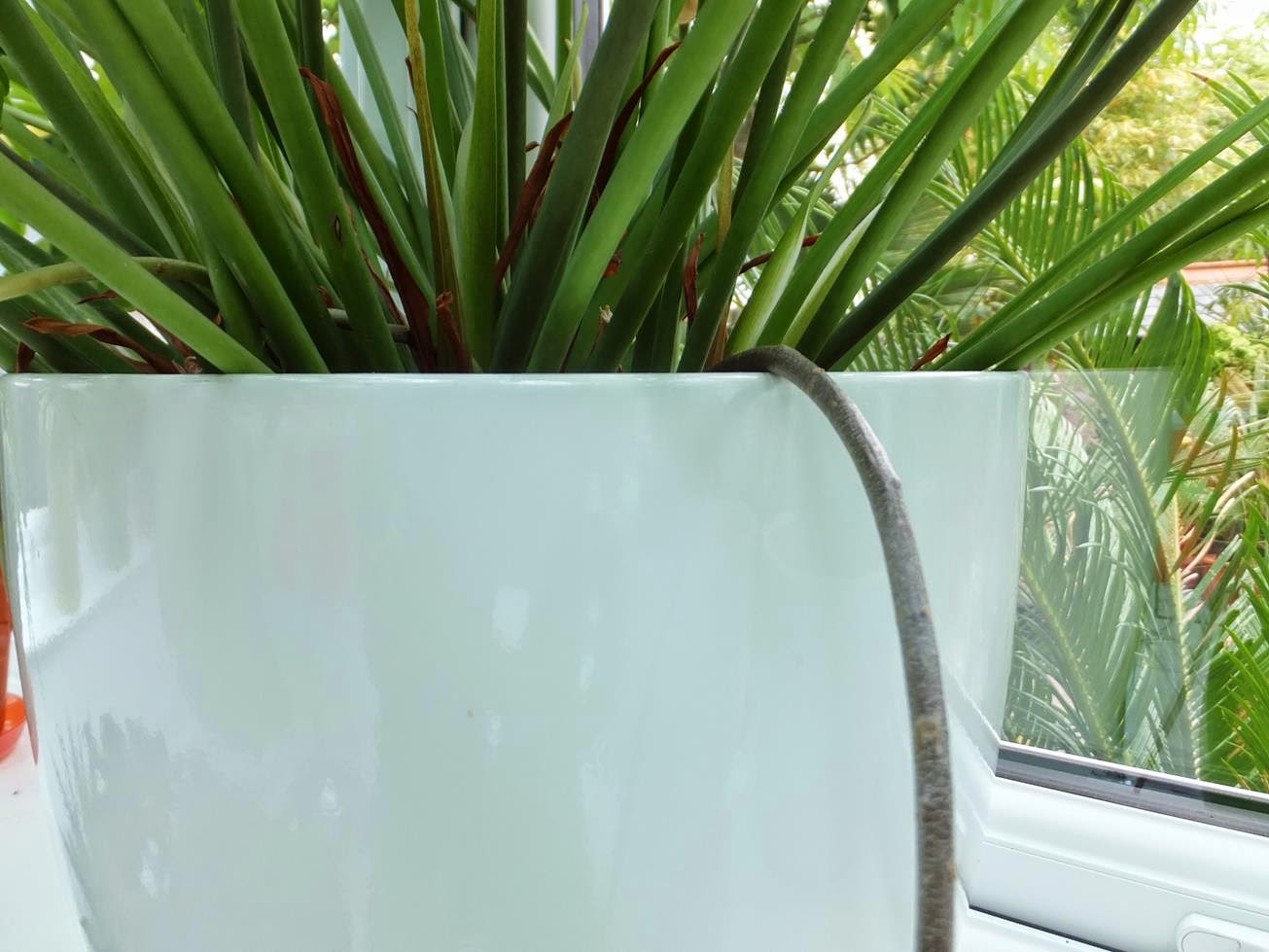 It turns out that one of the aerial roots of the Philodendron 'Xanadu' beside the cactus have leaped over its pot and has been inching its way out, perhaps over the past few days, or even weeks.