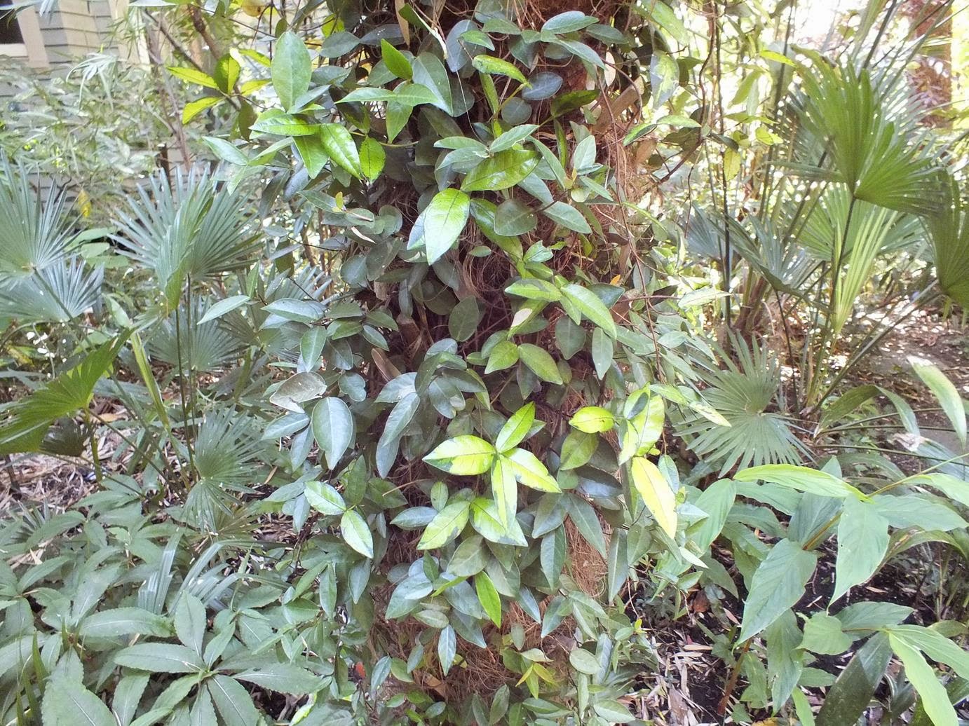 | I'll borrow this idea, variegated Trachelospermum asiaticum climbing up a Trachycarpus trunk |