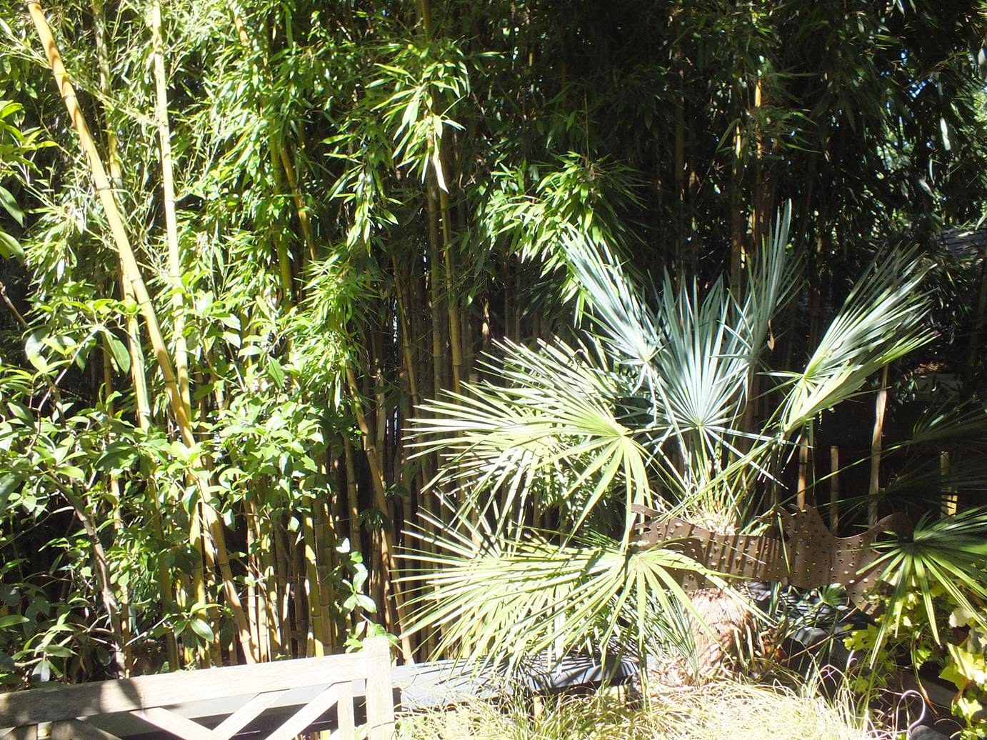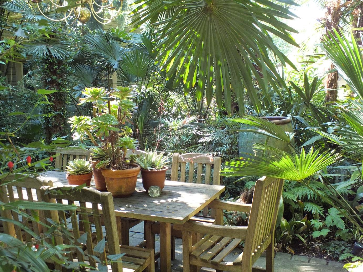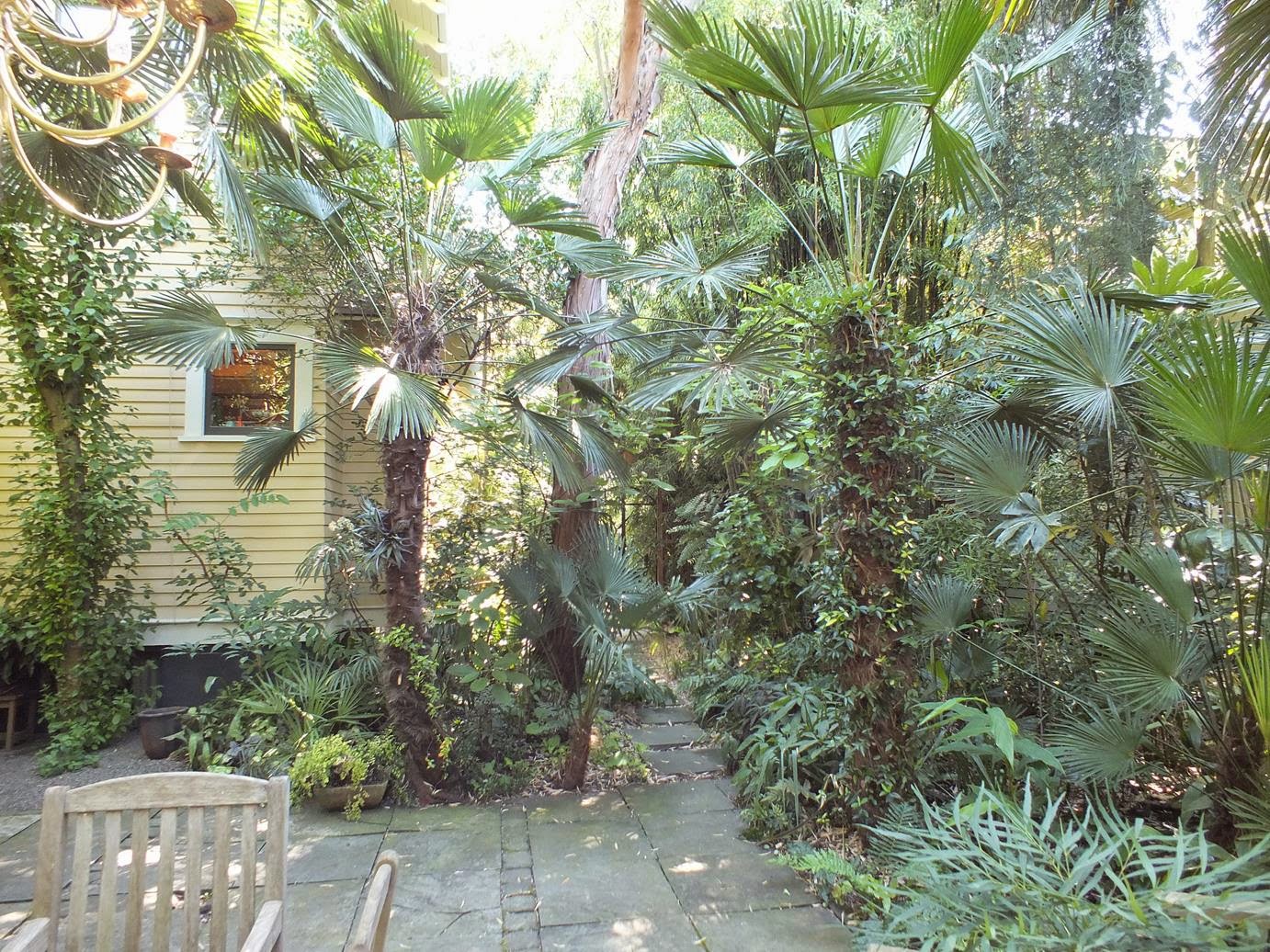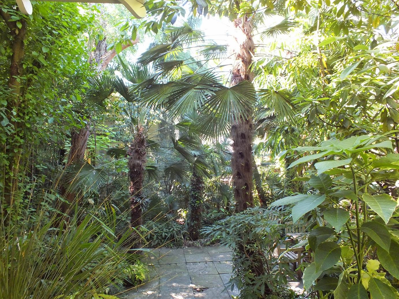 | With very tall Trachycarpus and other plants giving canopy, privacy, and sense of enclosure to the space |