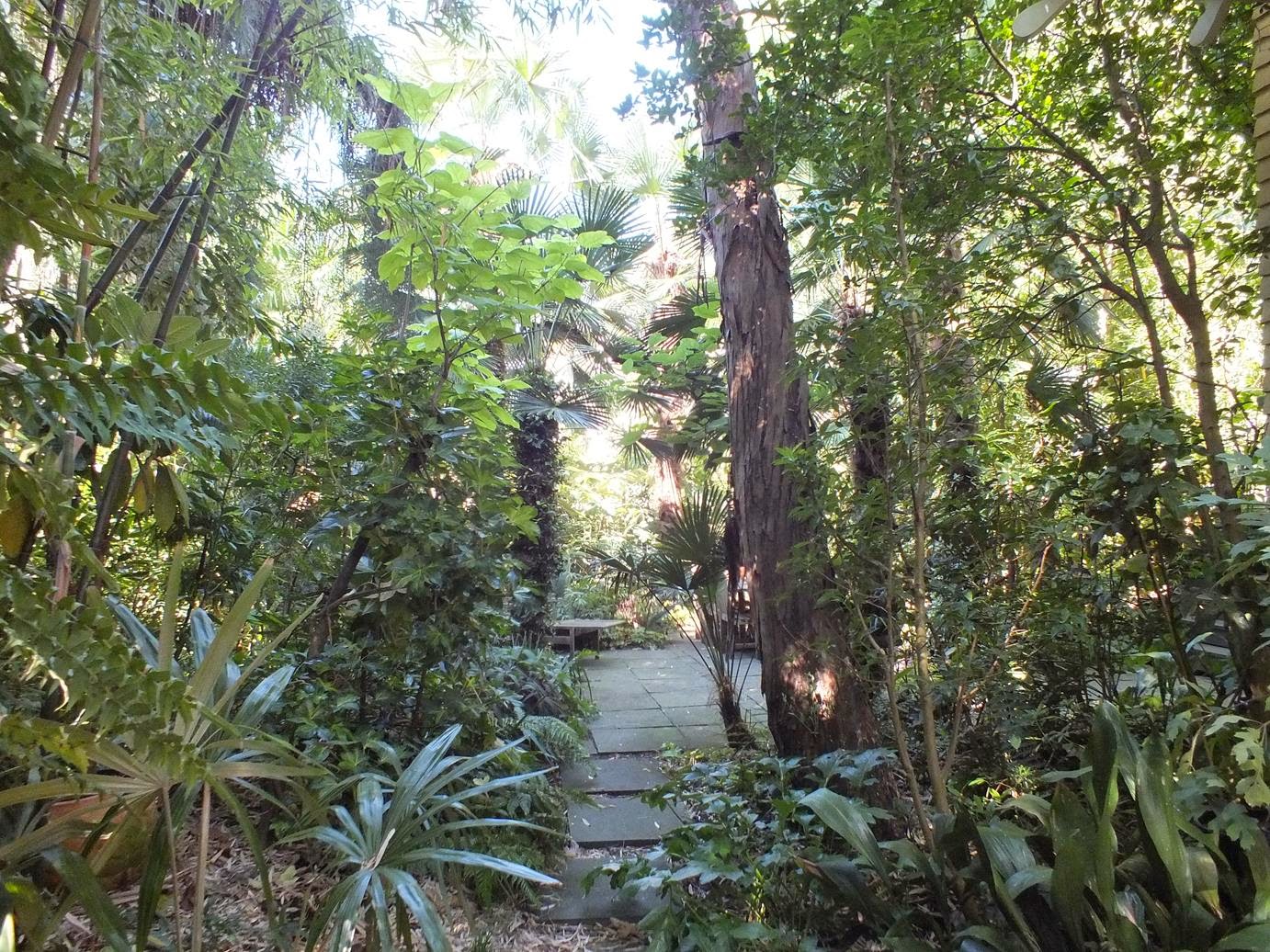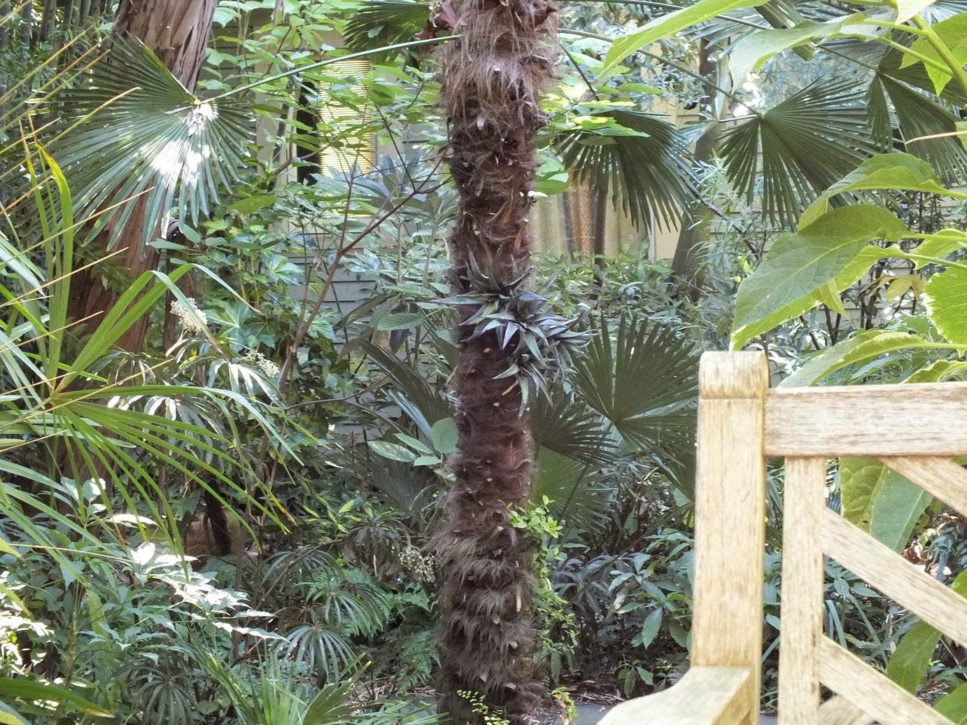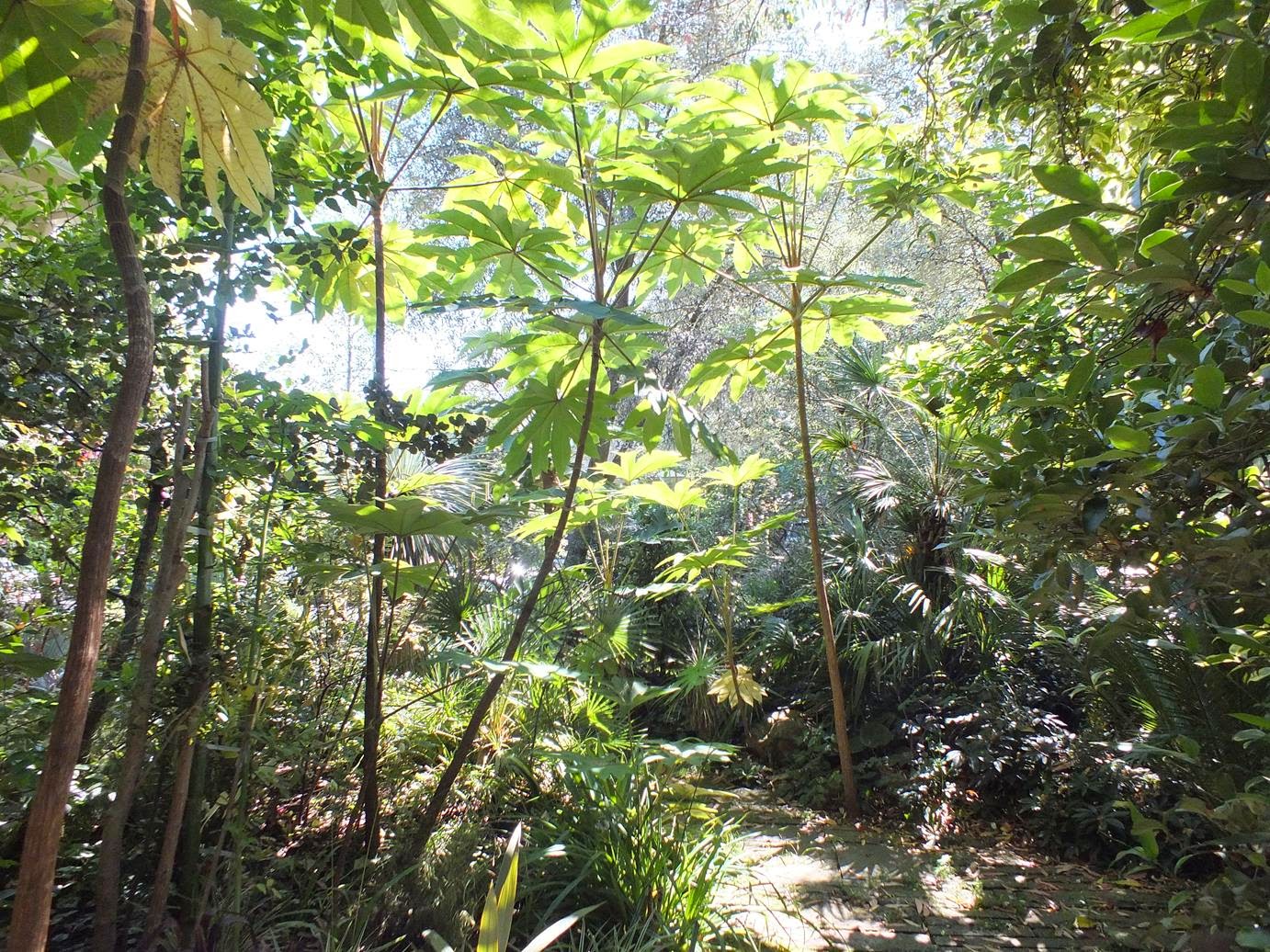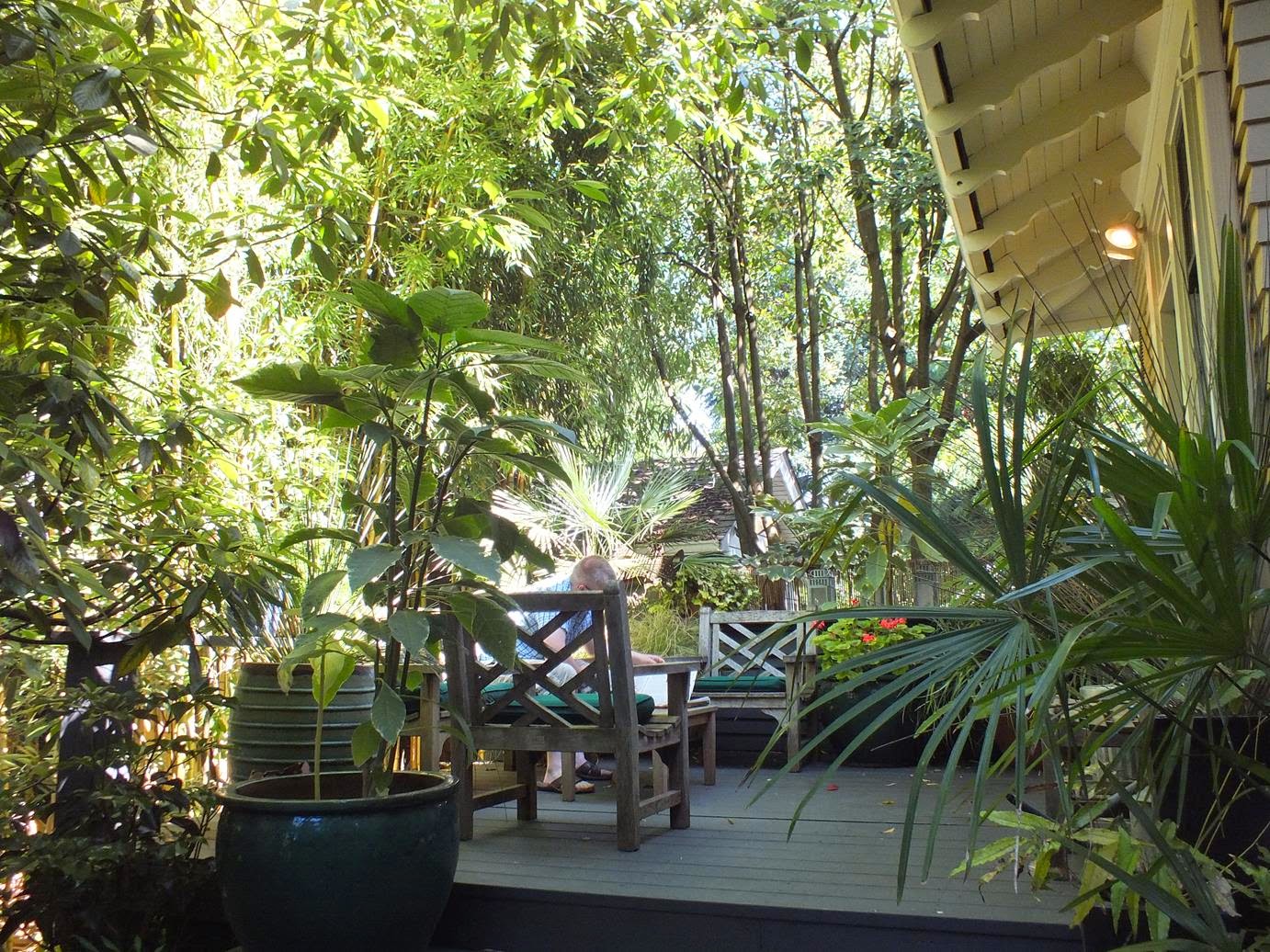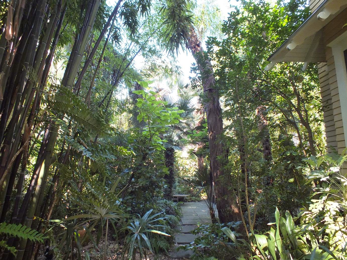 | With very tall Trachycarpus and other plants giving canopy, privacy, and sense of enclosure to the space |