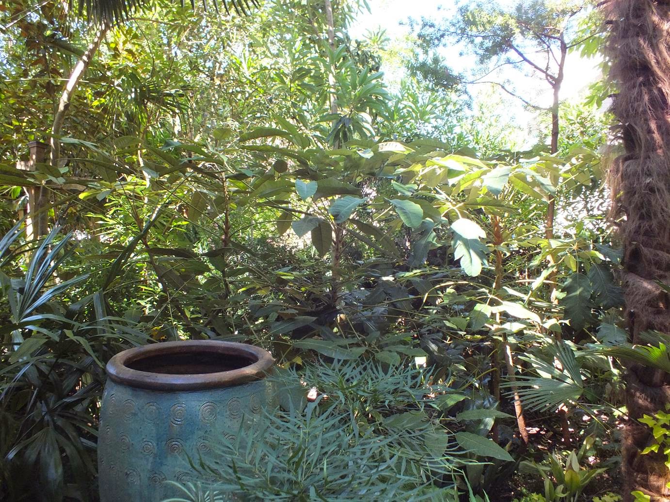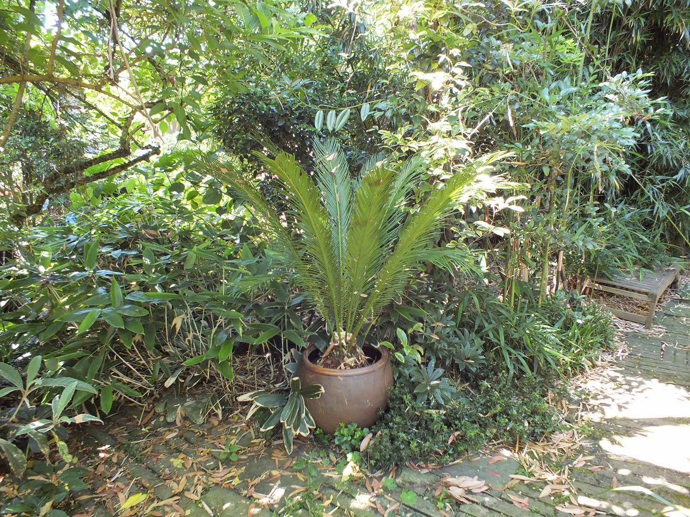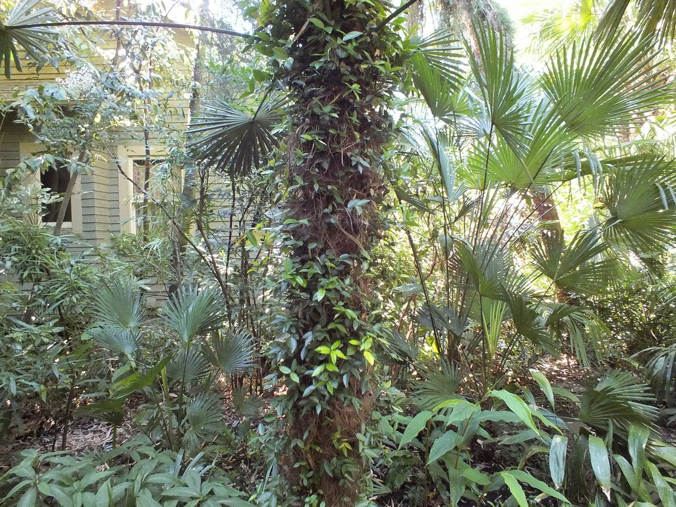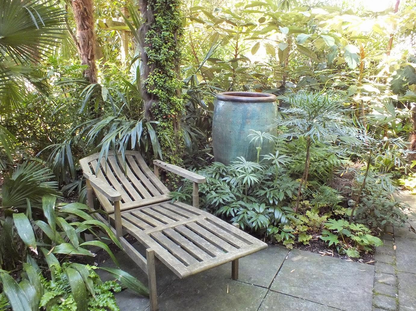 | With very tall Trachycarpus and other plants giving canopy, privacy, and sense of enclosure to the space |