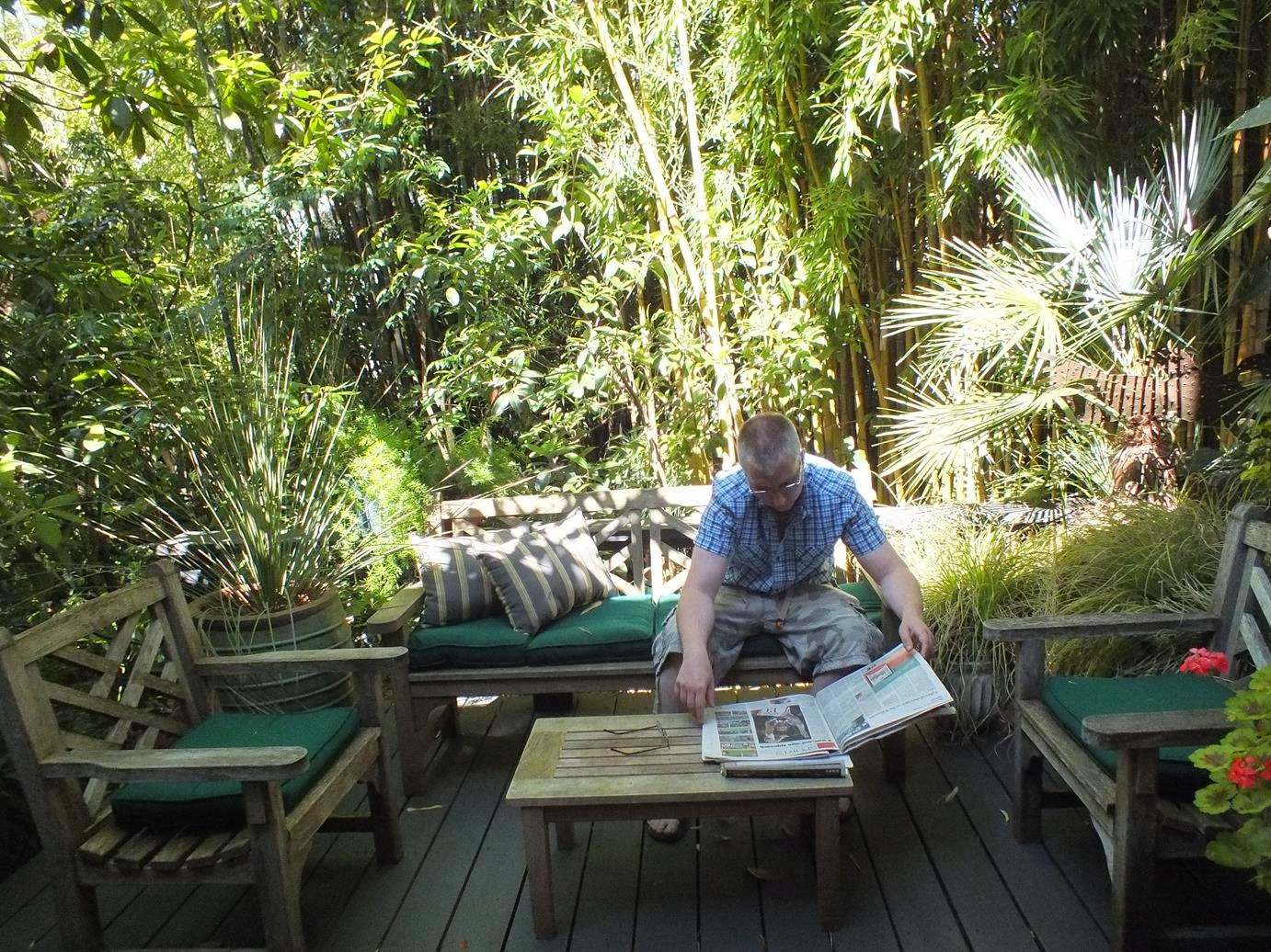 We arrived in the city the evening before wherein Loree met us at the airport and took us to Sean's place. Afterwards we all went out for dinner but as it was well dark already by the time we got back we had to wait till the morning to have a proper look of the garden. I have to say even in the dark you can make out the silhouette of the beautiful plants and you can tell already that it's a beautiful garden. So come the morning, after a lovely breakfast we sat out to relax in the back garden.